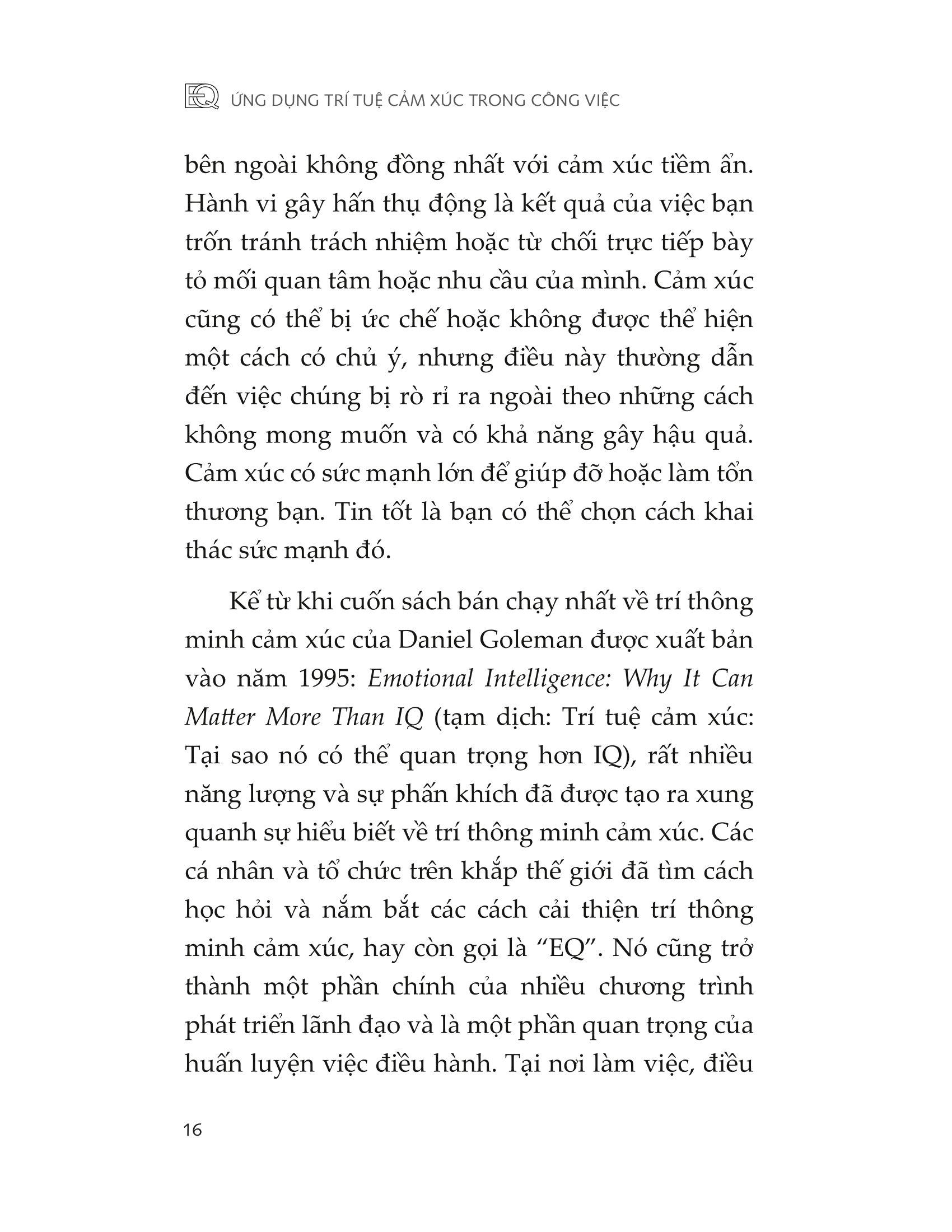 Trí thông minh cảm xúc tối ưu chính là về cách bạn thể hiện trong các mối quan hệ. Điều này có nghĩa là biết bản thân nghĩ gì, cảm thấy gì và muốn gì ở bên trong, và bạn có thể điều chỉnh điều này để thể hiện nó ra bên ngoài như thế nào. Đó cũng là về khả năng khai thác những gì người khác có thể nghĩ, cảm nhận, mong muốn, và sử dụng kiến thức này để giúp bạn định hướng mối quan hệ của mình với họ. Đó là về danh tiếng, sự đáng tin cậy và sự đồng cảm mà bạn thể hiện ra bên ngoài. Đó là về hành vi của bạn khi giao tiếp và cộng tác với người khác, mức độ đưa ra và nhận phản hồi cũng như khả năng quản lý căng thẳng và xung đột của chính mình. Làm việc hiệu quả với những người bị ảnh hưởng sâu sắc bởi cảm xúc của bạn, và đòi hỏi khả năng xoa dịu, kết nối và hòa nhập trong các mối quan hệ. Khi EQ của bạn cao, nó có thể cải thiện đáng kể tính hiệu quả của bản thân với những người khác cũng như giúp chính mình thăng tiến trong sự nghiệp. EQ không thể được phát triển ngoài các tương tác với người khác vì nó thể hiện trong hành vi của bạn và điều này chỉ có thể được phát triển duy trì trong các mối quan hệ. Một phần những gì khám phá trong cuốn sách này sẽ có ích nếu bạn không chọn thực hành các yếu tố EQ lên các mối quan hệ của mình. Điều này có thể yêu cầu bạn phải vượt ra ngoài vùng thoải mái để thay đổi hành vi của mình. Nó sẽ cần sự can đảm và, giống như bất cứ điều gì đáng làm, nó có thể đem lại lợi ích khổng lồ.