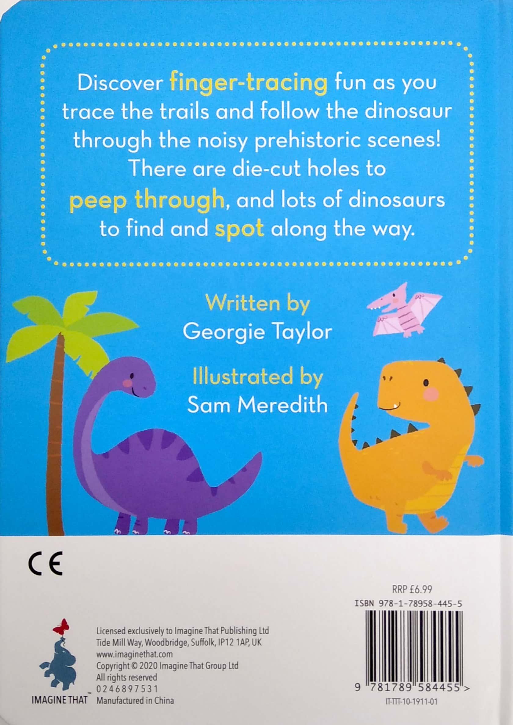 Explore the colourful illustrations as you trace the grooved trails on each page with your fingers and follow the dinosaur through the five different prehistoric scenes. Each scene is full of lots of other stomping, chomping and roaring dinosaurs to spot too. There are die-cuts to find and feel, plus holes lead you through the pages as you follow that dinosaur and find out where he is going!