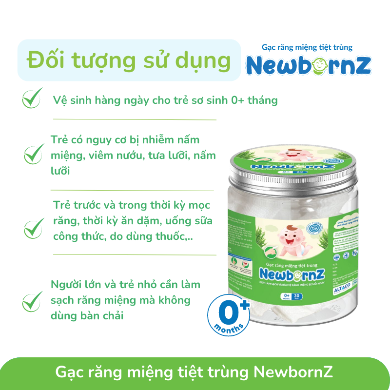 Gạc răng miệng tiệt trùng NewbornZ có thiết thế không tẩm dịch, dạng khô, sử dụng khô hoặc thấm với nước trắng và nước muối sinh lý. Gạc giúp làm sạch cặn thức ăn bám