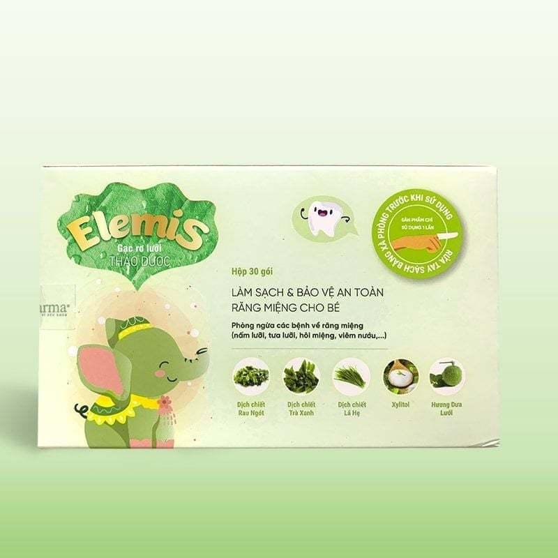 Gạc rơ lưỡi thảo dược Elemis bảo vệ răng nướu của bé mỗi ngày Ngay từ ngày đầu lọt lòng, ba mẹ cần vệ sinh răng miệng hàng ngày cho trẻ ít nhất 2 lần/ngày. Và gạc rơ lưỡi thảo dược Elemis chính là sự lựa chọn hoàn hảo giúp phòng tránh và hỗ trợ điều trị hiệu quả các vấn đề răng miệng ở trẻ. Đặc điểm nổi bật của gạc rơ lưỡi Elemis -Gạc được tẩm thành phần thảo dược có tác dụng làm sạch, phòng chống bệnh về răng miệng (nấm miệng, tưa lưỡi, viêm nướu,..) - Gạc làm bằng chất liệu sợi Poplyester mềm mại, hình ống tay tiện lợi  - Gạc hấp tiết trùng và tiệt trùng bằng gia Gamma, gạc vô khuẩn được đóng bọc bao bì độc lập từng chiếc, ngăn chặn tối ưu vi khuẩn xâm nhập.  - Gạc có vị ngọt dịu, phù hợp cho cả trẻ sơ sinh và trẻ nhỏ  Thành phần xanh và lành của gạc rơ lưỡi thảo dược Elemis Mỗi gạc mềm được tẩm bởi: Dịch chiết rau ngót, Dịch chiết chè xanh, Dịch chiết hẹ, Hương dưa lưới, Xylitol, NaCl. - Dịch chiết rau ngót (Sauropus androgynus extract): có tác dụng kháng khuẩn, chống viêm, loại bỏ vi khuẩn trong khoang miệng - Dịch chiết chè xanh (Camellia sinensis extract): Làm sạch, kháng khuẩn và phòng chống tưa lưỡi - Dịch chiết hẹ (Allium ramosum extract): có tác dụng chống tưa lưỡi, nấm miệng, viêm nướu - Hương dưa lưới (Hami melon flavour): mùi thơm dễ chịu giúp bé “hợp tác hơn” - Xyliton: Chống sâu răng, sún răng, làm sạch mảng bám trong miệng - NaCl: Có tác dụng làm sạch các mảng bám, cặn sữa, thức ăn Công dụng tuyệt vời của gạc rơ lưỡi Elemis - Vệ sinh răng miệng hằng ngày giúp làm sạch khoang miệng gồm: lưỡi, nướu, răng, túi má cho trẻ từ sơ sinh - Phòng và hỗ trợ điều trị các bệnh về răng miệng như nấm lưỡi, tưa lưỡi, hôi miệng, viêm nướu,… - Loại bỏ mảng bám, cặn sữa, thức ăn và vi khuẩn trong khoang miệng, chống sâu răng, mủn răng - Giúp nướu khỏe, giảm cảm giác đau khi mọc răng ở trẻ Đối tượng sử dụng gạc rơ lưỡi Elemis - Trẻ sơ sinh và trẻ nhỏ đang ăn sữa, ăn dặm có nguy cơ gặp các vấn đề về răng miệng. - Trẻ đang mọc răng hoặc đã mọc răng nhưng chưa biết tự vệ sinh răng miệng.   Hướng dẫn sử dụng gạc rơ lưỡi Elemis - Bước 1: Rửa sạch tay bằng xà phòng trước khi sử dụng. - Bước 2: Cho ngón tay trỏ vào bên trong gạc. Nhẹ nhàng vệ sinh khoang miệng cho bé, từ lưỡi, nướu, răng, đến 2 bên túi má. Liệu trình sử dụng gạc rơ lưỡi thảo dược Elemis - Hàng ngày, vệ sinh răng miệng cho trẻ sơ sinh và trẻ nhỏ chưa biết đánh răng từ 1 – 2 lần/ngày. - Với bé đang bị nấm lưỡi, tưa lưỡi: lau 3 lần/ngày. - Với bé đang bị viêm nướu, sưng lợi mọc răng: dùng gạc nhẹ nhàng massage phần nướu (lợi) bị sưng để giúp bé dễ chịu hơn. Chú ý: - Gạc chỉ sử dụng 1 lần. Nên sử dụng ngay sau khi mở gói. - Không vệ sinh răng miệng khi bé vừa ăn no.