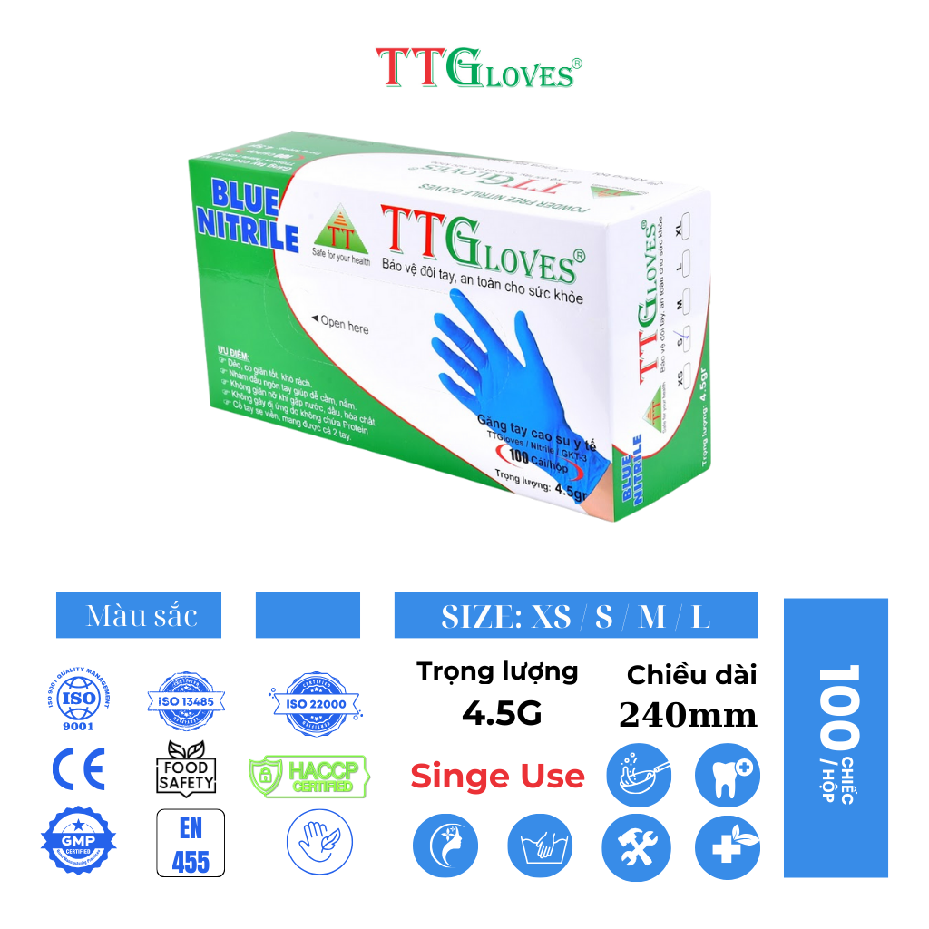 Găng Tay Cao Su Y Tế Size XS Không Bột Nitrile TTGLOVES Màu Xanh (100 Chiếc) TTGLoves là thương hiệu găng tay của công ty TNHH Sản Xuất & Thương Mại Toàn Tâm Gloves.
