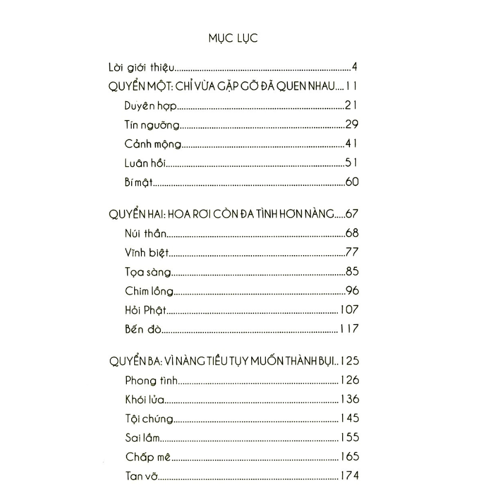 Mua tại TiktokGặp Lại Chốn Hồng Trần Sâu Nhất (Tái Bản) "Duyên là gì? Duyên là gặp nhau nơi ngã tư đường, là nắm tay chốn hồng trần xa lạ; duyên là muôn đóa hoa xuân đồng loạt nở rộ, là hai phiến lá thu cùng nhau rụng xuống; duyên là đối thoại giữa non và nước, là mặt trời và mặt trăng đồng thời xuất hiện. Gặp nhau, quen nhau giữa biển người mênh mông chính là duyên, lưu lạc giữa hồng trần lại không lãng quên chính là duyên. Gặp gỡ, là một kiếp nạn hạnh phúc, cũng là một nét đẹp sai lầm. Quên nhau, là một sự khởi đầu hoang mang, cũng là sự kết thúc trong trẻo." (Trích Duyên xưa)
