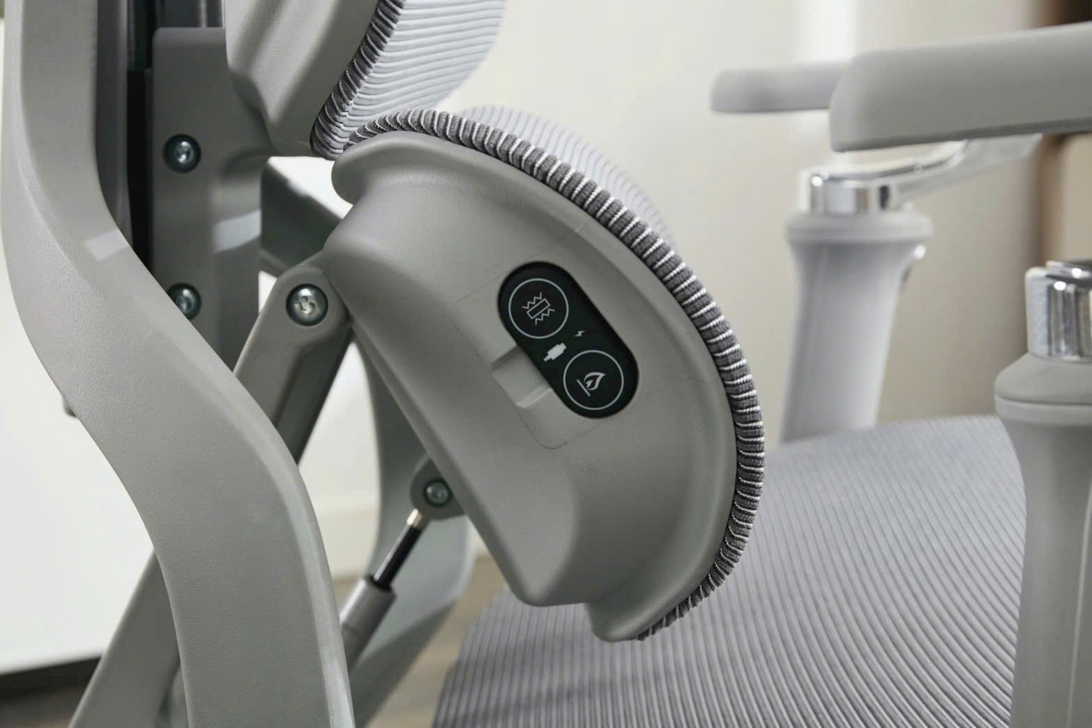 • Điều chỉnh tay vịn: Bấm nút trên tay ghế để nâng hạ, xoay trái – phải, tiến – lùi cho phù hợp.