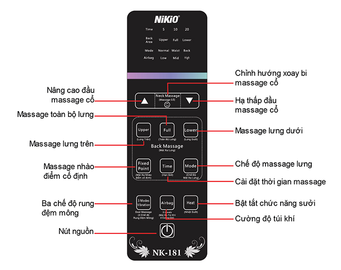 • Nút Air Bag: Tùy chỉnh cường độ áp suất không khí. Nhấn lần đầu tiên túi khí co bóp với cường độ thấp, lần nhấn thứ hai co bóp với cường độ trung bình, lần nhấn thứ ba túi khí co bóp với cường độ cao, lần nhấn thứ tư để dừng chức năng massage túi khí. (Cường độ co bóp túi khí được hiển thị ở màn hình phía trên).