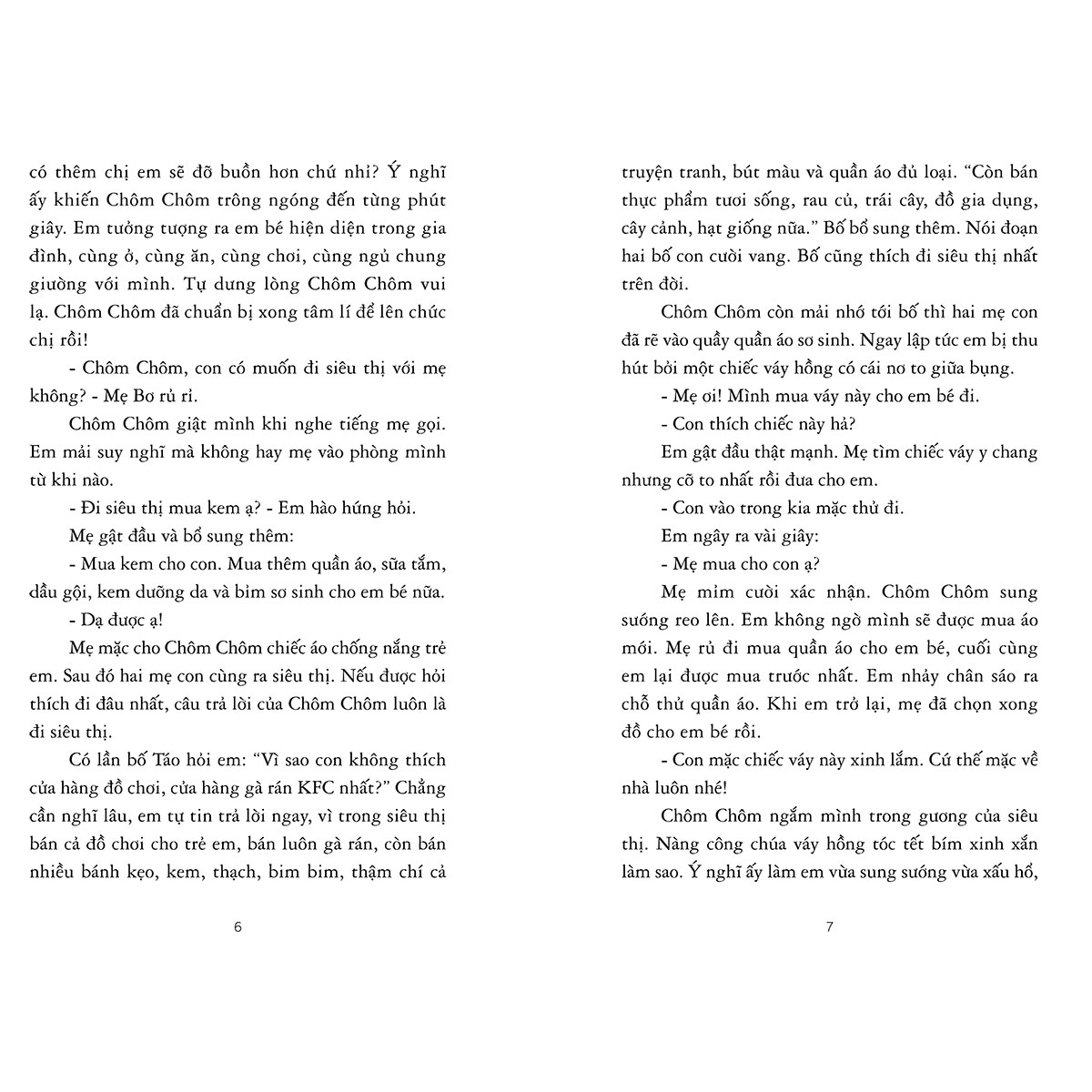 “Chôm Chôm rủ Ổi ra sân vẽ tranh. Sau trận mưa rào, bầu trời xuất hiện cầu vồng. Cầu vồng trong tranh của Chôm Chôm nằm vắt vẻo trên ngọn cây xoài. Còn cầu vồng trong tranh của Ổi như dải lụa bảy màu, nơi lũ chim trời tụ tập chơi trò ú òa mà hồi một tuổi Ổi rất thích.”
