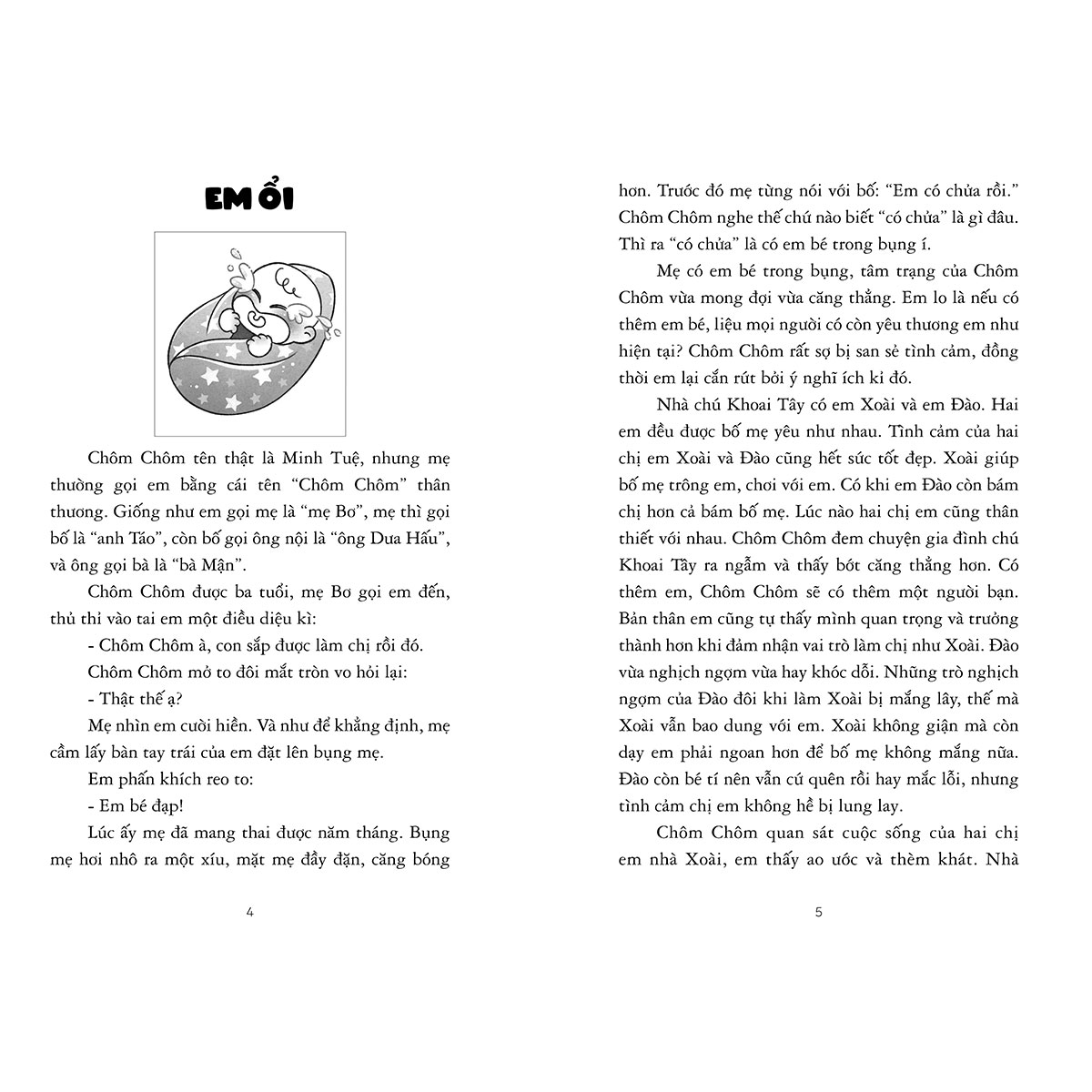 tình cảm của bố mẹ, cô bé lại trở thành người chị thương yêu em Ổi nhất nhà. Cùng bố Táo, mẹ Bơ, bà Mận, ông Dưa Hấu, cuộc sống của hai chị em lấp lánh niềm vui, được bảo bọc bởi sự trìu mến, bao dung.