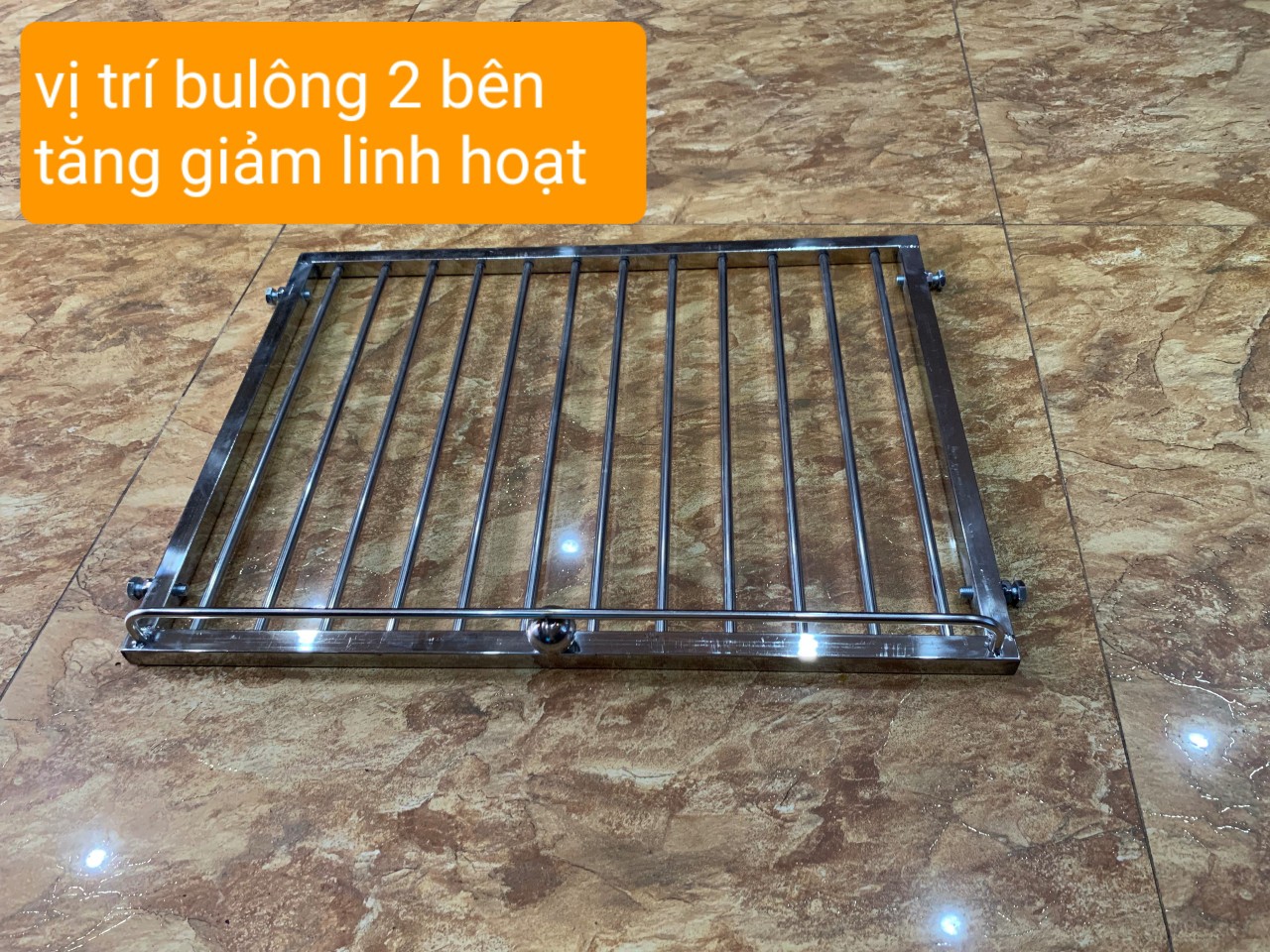 - / kích thước giá. rộng x sâu . 105 x 50 cm ( không tính bulong) 3./ sp được thiết kế thông minh với 4 bulong 2 bên rễ dàng tăng chỉnh linh hoạt theo kích thước dao động cho phép 4./ công năng . sử dụng chủ yếu xoong nồi . bát đĩa . rổ giá ác vận dụng nhà bếp vv 5./ khoảng cách nan phi 4 cm LƯU Ý BẮT BUỘC... kích thước giá 105 cm sẽ phù hợp với kích thước lắp đặt dao động từ 108 - 111 cm ƯU ĐIỂM ́ inox nhà bếp thông minh (KAOA) có thể rễ dàng tháo .lắp linh hoạt mỗi khi vệ sinh không gian phòng bếp cách lắp đặt đơn giản không cần thợ