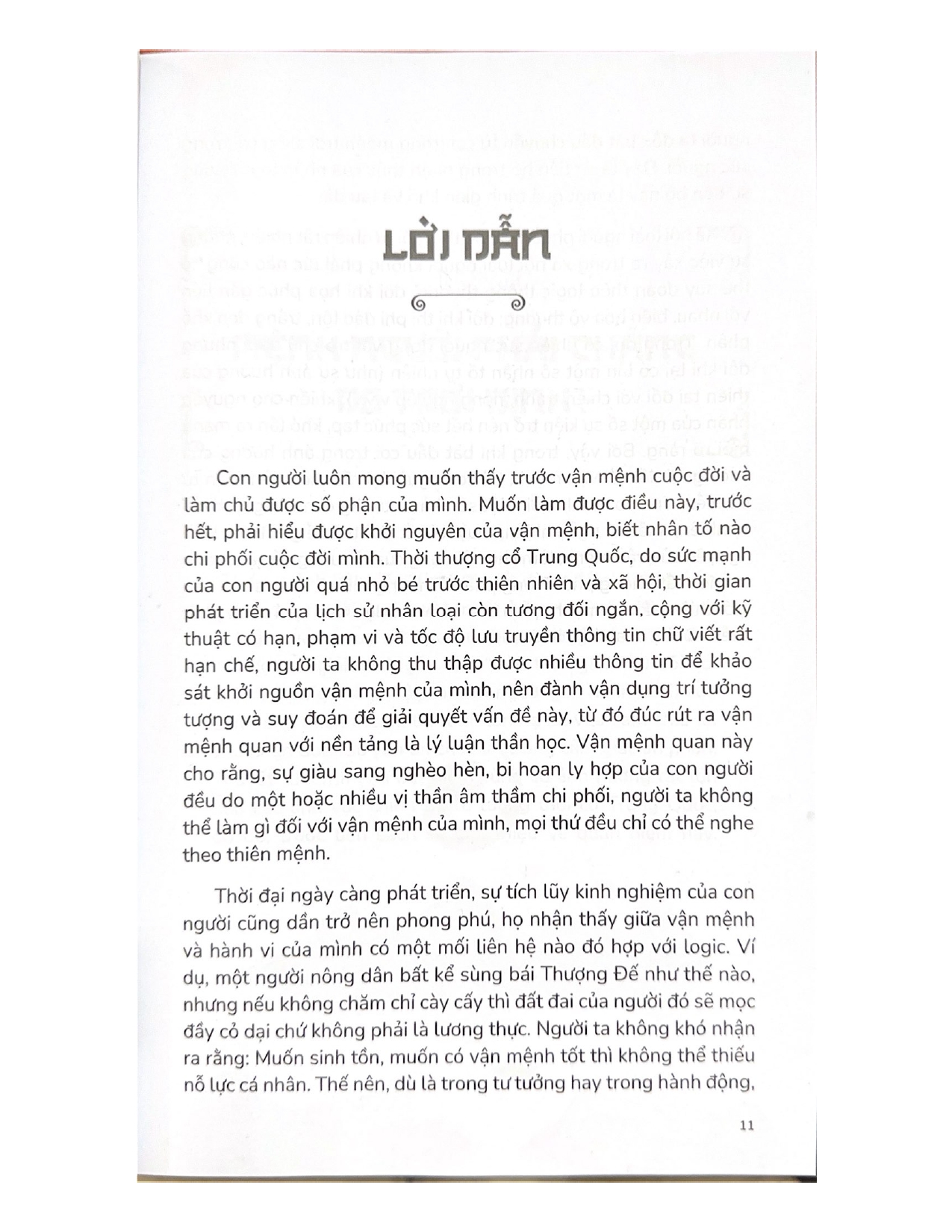 Có lẽ, ai cũng mong muốn thấy trước vận mệnh cuộc đời và làm chủ được số phận của mình. Muốn làm được điều này, trước hết, phải hiểu được khởi nguyên của vận mệnh, biết nhân tố nào chi phối cuộc đời mình. Trong khi bắt đầu coi trọng ảnh hưởng của sức người đối với vận mệnh, thì con người lại rất khó hoàn toàn từ bỏ niềm tin vào mệnh trời. Mặc dù dự đoán vận mệnh có hạn chế rất lớn, nhưng không thể không thừa nhận rằng, đây là phương pháp đúng đắn.