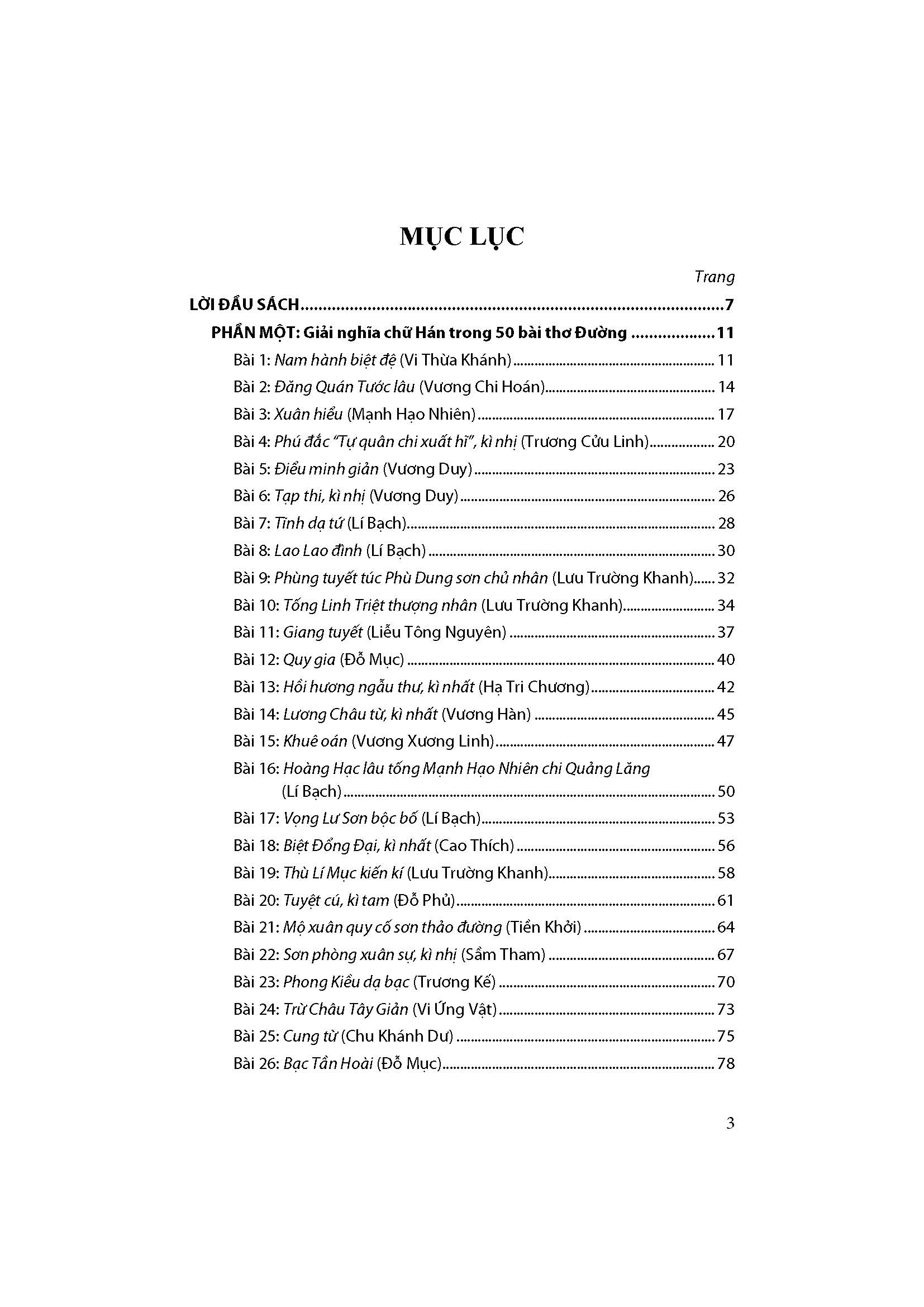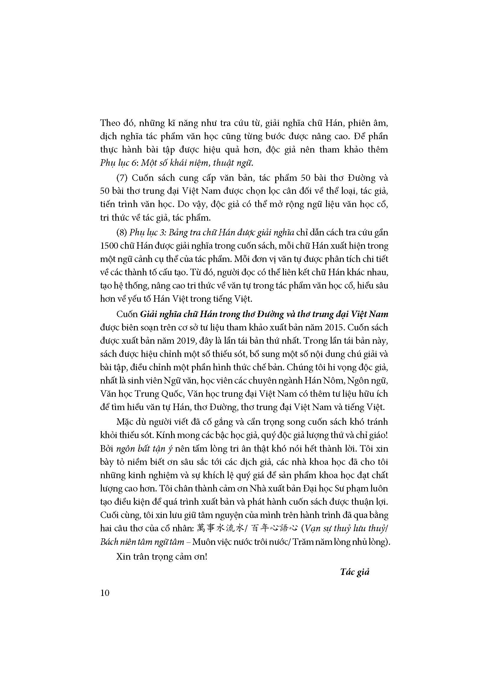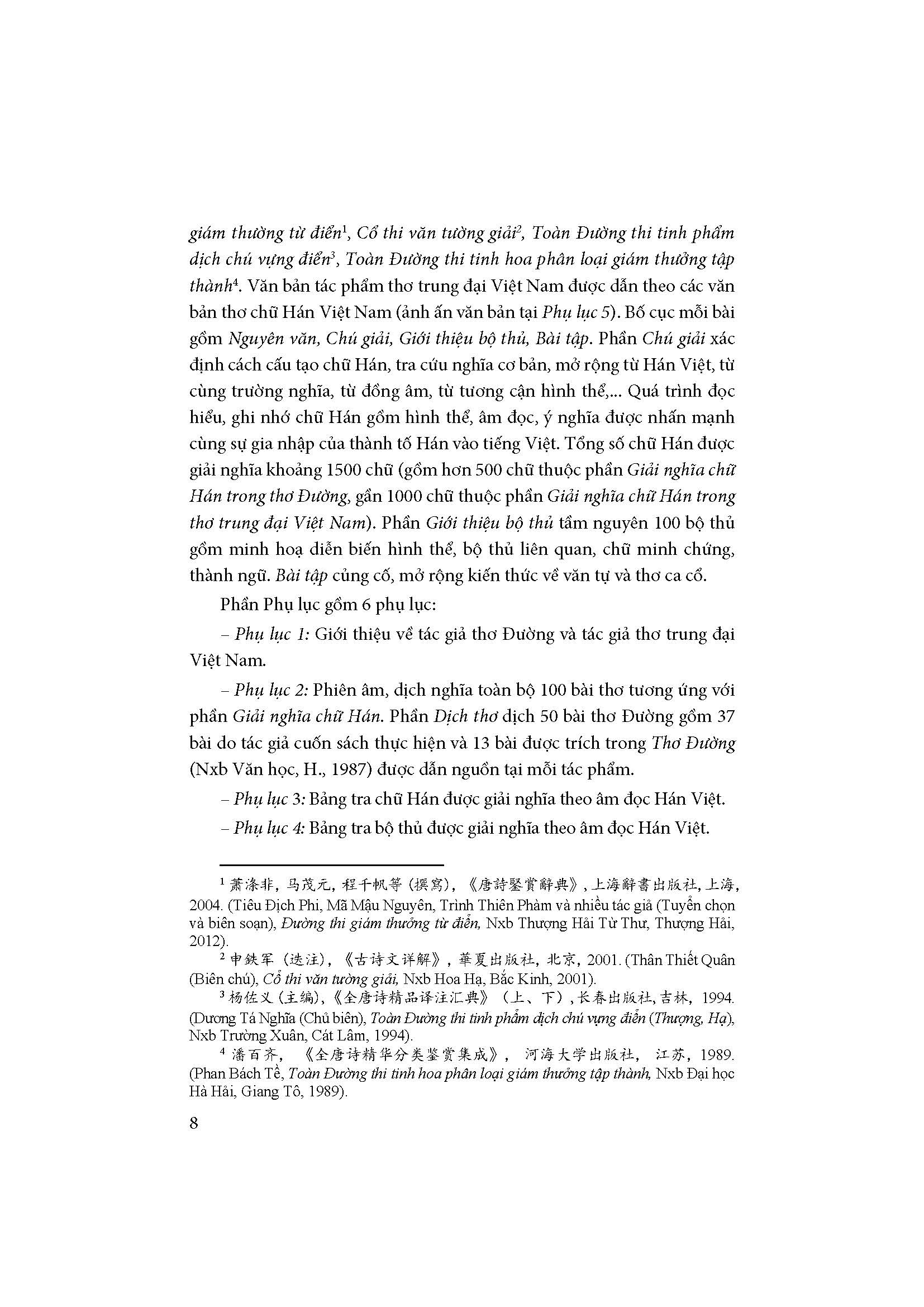 Bên cạnh đó, các Phụ lục trong cuốn sách này sẽ giúp bạn đọc tra cứu thêm các chữ Hán chưa được giải nghĩa trong từng bài thơ; tìm hiểu thêm về bộ thủ cũng như phần phiên âm, dịch nghĩa 100 bài thơ và bản dịch 50 bài thơ Đường; chỉ dẫn cách tra cứu khoảng 1500 chữ Hán được giải nghĩa trong cuốn sách, mỗi chữ Hán xuất hiện trong một ngữ cảnh cụ thể của tác phẩm.