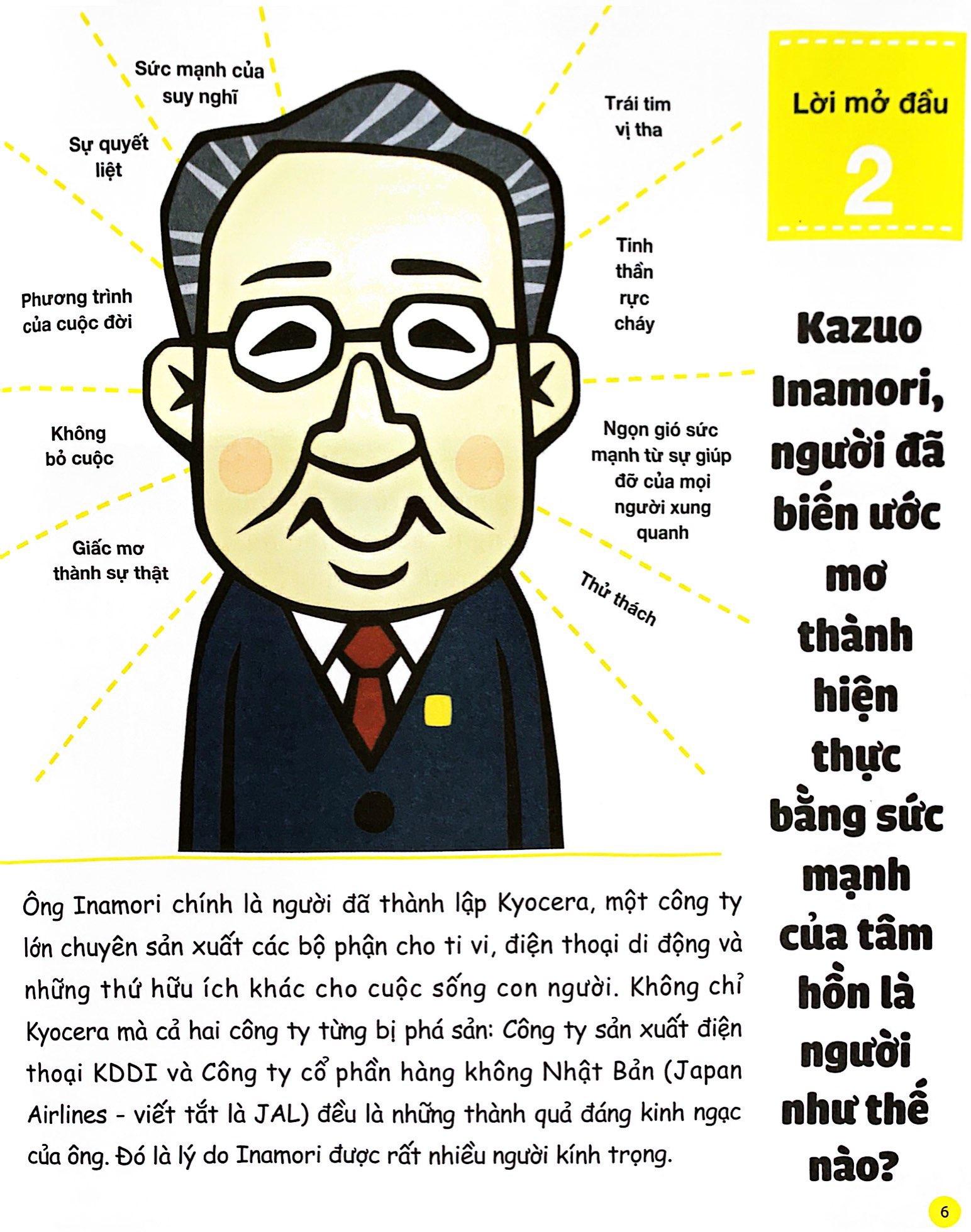 Hãy cùng học tập những triết lý cuộc sống của ông Inamori Kazuo, người lãnh đạo tài ba của Nhật Bản. Dựa vào những triết lý và tấm lòng vị tha của mình, ông đã thành lập tập đoàn Kyocera và KDDI, đồng thời phục sinh hãng hàng không quốc doanh JAL. Đây là cuốn sách đầu tiên bao gồm những triết lý của ông Inamori dành cho trẻ em, súc tích, bao hàm, nuôi dưỡng trong những chủ nhân tương lai tấm lòng chân thành, trung thực trong công việc và biết suy nghĩ cho người khác. Để tăng hứng thú cho trẻ, cuốn sách còn kết hợp các mẩu truyện tranh ngắn cùng hình minh họa nhiều màu sắc. “Tôi muốn nói với các bạn nhỏ, những chủ nhân tương lai của đất nước, rằng điều quan trọng nhất trong cuộc sống là nuôi dưỡng và phát triển một tâm hồn đẹp. Tại sao trạng thái của tâm trí lại quan trọng như vậy? Đó là vì những điều tâm trí thường xuyên nghĩ đến chắc chắn sẽ xảy ra trong đời như một kết quả tất yếu. Người có lòng tốt sẽ có kết quả tốt, người có tâm xấu sẽ có kết quả xấu. Nói cách khác, tâm ta thế nào thì đời ta thế ấy. Tôi nhận ra điều này trong đời sống cá nhân cũng như trong việc kinh doanh, vì thế mà tôi luôn cố gắng giữ cho mình một tâm hồn đẹp nhất có thể. Từ những kinh nghiệm này của bản thân, tôi đã viết cuốn sách này với mong muốn truyền tải những suy nghĩ và tấm gương tốt mà tôi nghĩ các bạn nhỏ nhất định sẽ cần. Nội dung sách sẽ được trình bày bằng những từ ngữ và hình ảnh minh họa dễ hiểu. Tôi hi vọng cuốn sách sẽ góp phần giúp nuôi dưỡng một tâm hồn đẹp để trong tương lai, trẻ có thể thực hiện được những ước mơ to lớn, sống một cuộc đời trọn vẹn và tuyệt vời.” Inamori Kazuo Mục lục: Lời mở đầu 1 Lời mở đầu 2 Lời mở đầu 3 Chương 1: Hãy có một trái tim nhân ái! Chương 2: Hãy sống nghiêm túc! Chương 3: Suy nghĩ chắc chắn sẽ thành sự thật! Chương 4: Lao động có nghĩa là gì? Phụ lục Thông tin tác giả: Ông Inamori chính là người đã thành lập Kyocera, một công ty lớn chuyên sản xuất các bộ phận cho tivi, điện thoại di động và những thứ hữu ích khác cho cuộc sống con người. Không chỉ Kyocera mà cả hai công ty từng bị phá sản: Công ty sản xuất điện thoại KDDI và Công ty cổ phần hàng không Nhật Bản (Japan Airlines) đều là những thành quả đáng kinh ngạc của ông.