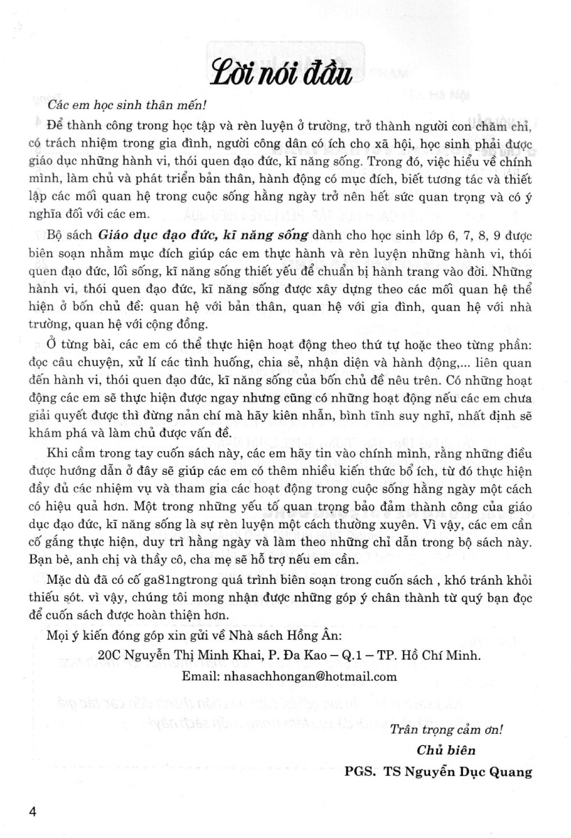 Bộ sách Giáo dục đạo đức, kĩ năng sống dành cho học sinh lớp 6, 7, 8, 9 được biên soạn nhằm mục đích giúp các em thực hành và rèn luyện những hành vi, thói quen đạo đức, lối sống, kĩ năng sống thiết yếu để chuẩn bị hành trang vào đời. Những hành vi, thói quen đạo đức, kĩ năng sống được xây dựng theo các mối quan hệ thể hiện ở bốn chủ đề: quan hệ với bản thân, quan hệ với gia đình, quan hệ với nhà trường. quan hệ với cộng đồng.