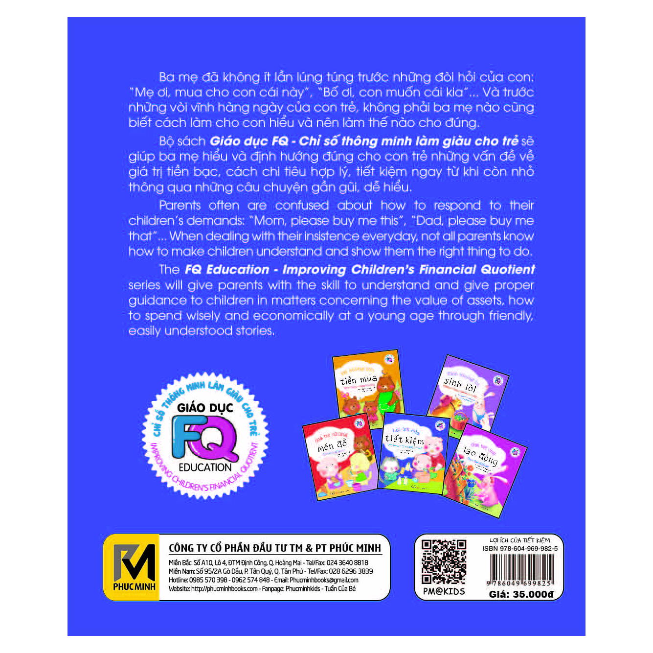 Bộ sách Giáo dục FQ – Chỉ số thông minh làm giàu cho trẻ gồm 5 cuốn: Để không tốn tiền mua; Giá trị của lao động; Giá trị của những món đồ; Lợi ích của tiết kiệm; Tiền không tự sinh lời… Những câu chuyện dễ hiểu sẽ là trợ thủ đắc lực cho ba mẹ trong việc định hướng đúng cho con những về liên quan đến tài chính như chi tiêu thế nào cho hợp lý, sử dụng tiền bạc như thế nào? Làm thế nào để tiết kiệm…