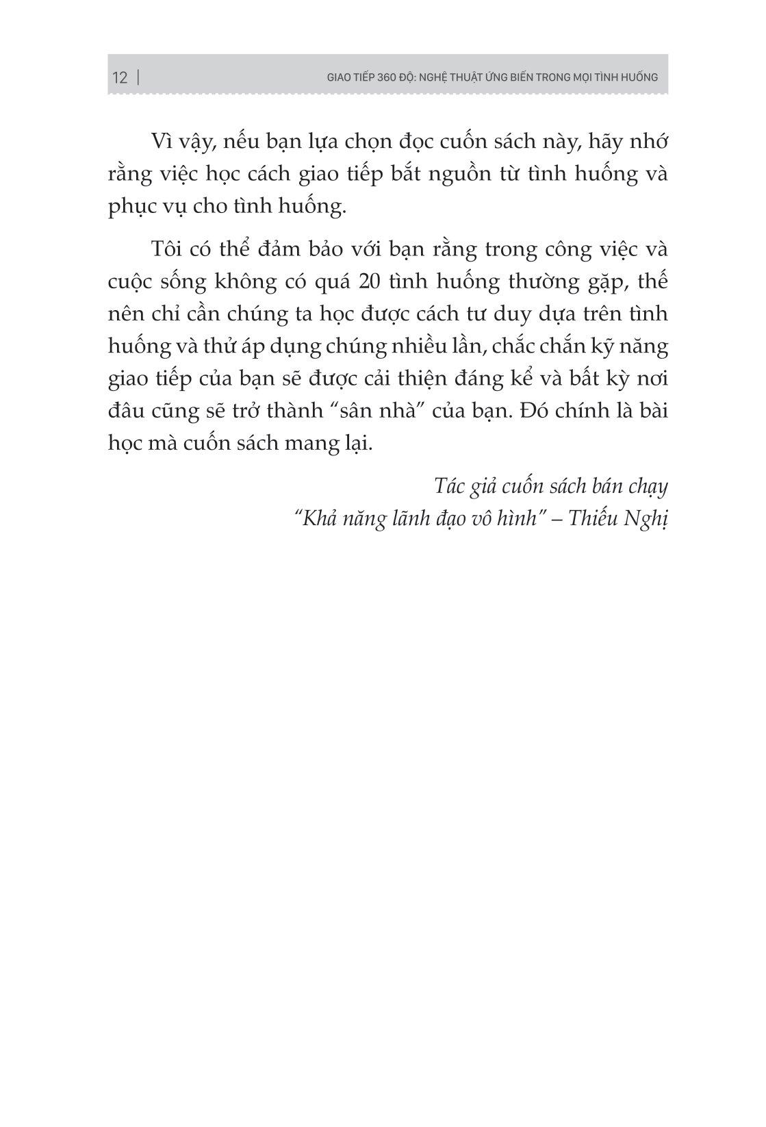 Đây quả thực là một cuốn sách vô cùng tuyệt vời giúp bạn có kỹ năng giao tiếp tốt để thành công trong bất cứ lĩnh vực nào bao gồm cả công việc, tình yêu, gia đình, bạn bè. Đừng chần chừ mà hãy bắt đầu phát triển một kỹ năng mềm quan trọng cho bản thân m.ình thông qua cuốn sách Giao Tiếp 360 độ: Nghệ thuật ứng biến trong mọi tình huống này bạn nhé!