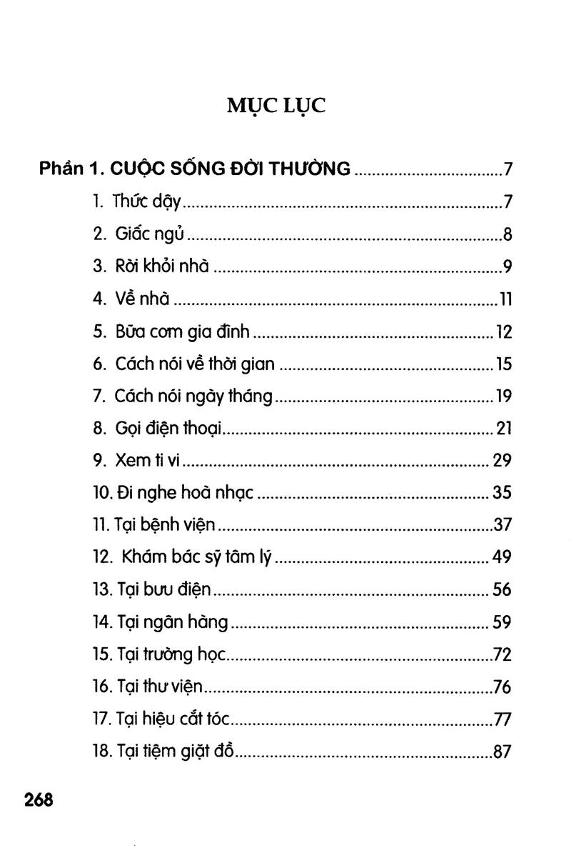 Nội dung của cuốn sách này chủ yếu là các mẫu câu ngắn gọn, thường gặp trong cuộc sống, từ việc bàn về thời gian, ngày tháng, thời tiết đến khám chữa bệnh, thuê xe,