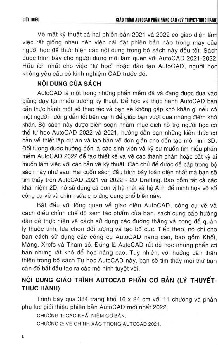 Trong đó 4 cuốn đầu trình bày cả lý thuyết và bài tập, quyển thứ năm trình bày chủ yếu là bài tập thực hành. Các tập từ 1 đến 5 được thực hiện trên phiên bản AutoCAD 2021, tập 6 thực hiện trên phiên bản mới nhất của AutoCAD đó là AutoCAD và AutoCAD 3D 2022 .
