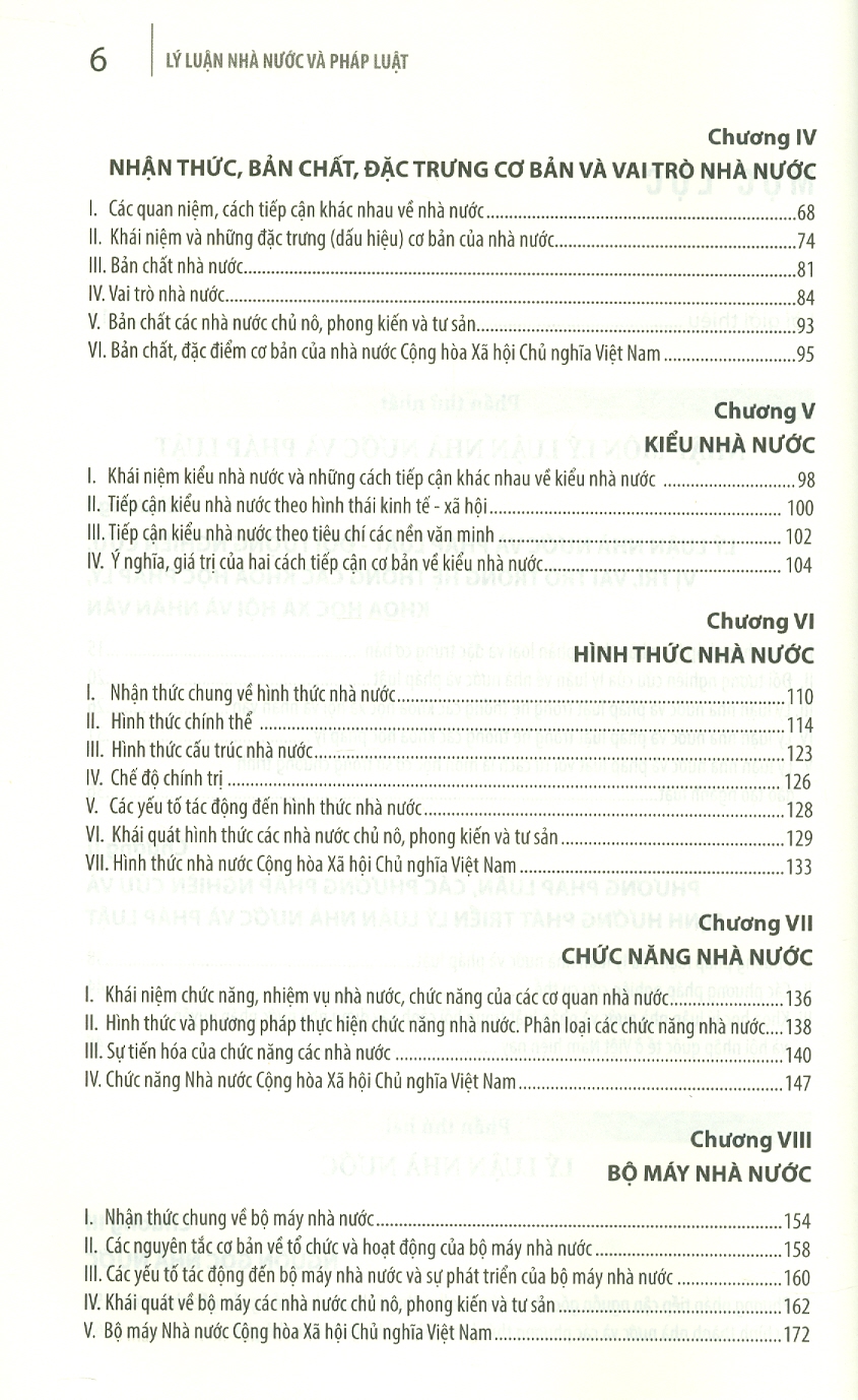 Cuốn sách có dung lượng 540 trang được chia làm 27 chương, hệ thống các vấn đề được trình bày chi tiết và sáng rõ; các khái niệm, phạm trù, quan điểm cơ bản về nhà nước và pháp luật truyền thống được kế thừa nhưng đã có sự điều chỉnh, bổ sung nhất định để đảm bảo tính mới về lý luận và phù hợp thực tiễn xây dựng, phát triển đất nước theo quan điểm, chính sách và pháp luật Nhà nước Việt Nam hiện nay; giúp bồi dưỡng cho sinh viên, học viên tư duy pháp lý, năng lực phân tích, tiếp cận các hiện tượng, vấn đề chính trị - pháp lý sinh động và đa dạng của thực tiễn.