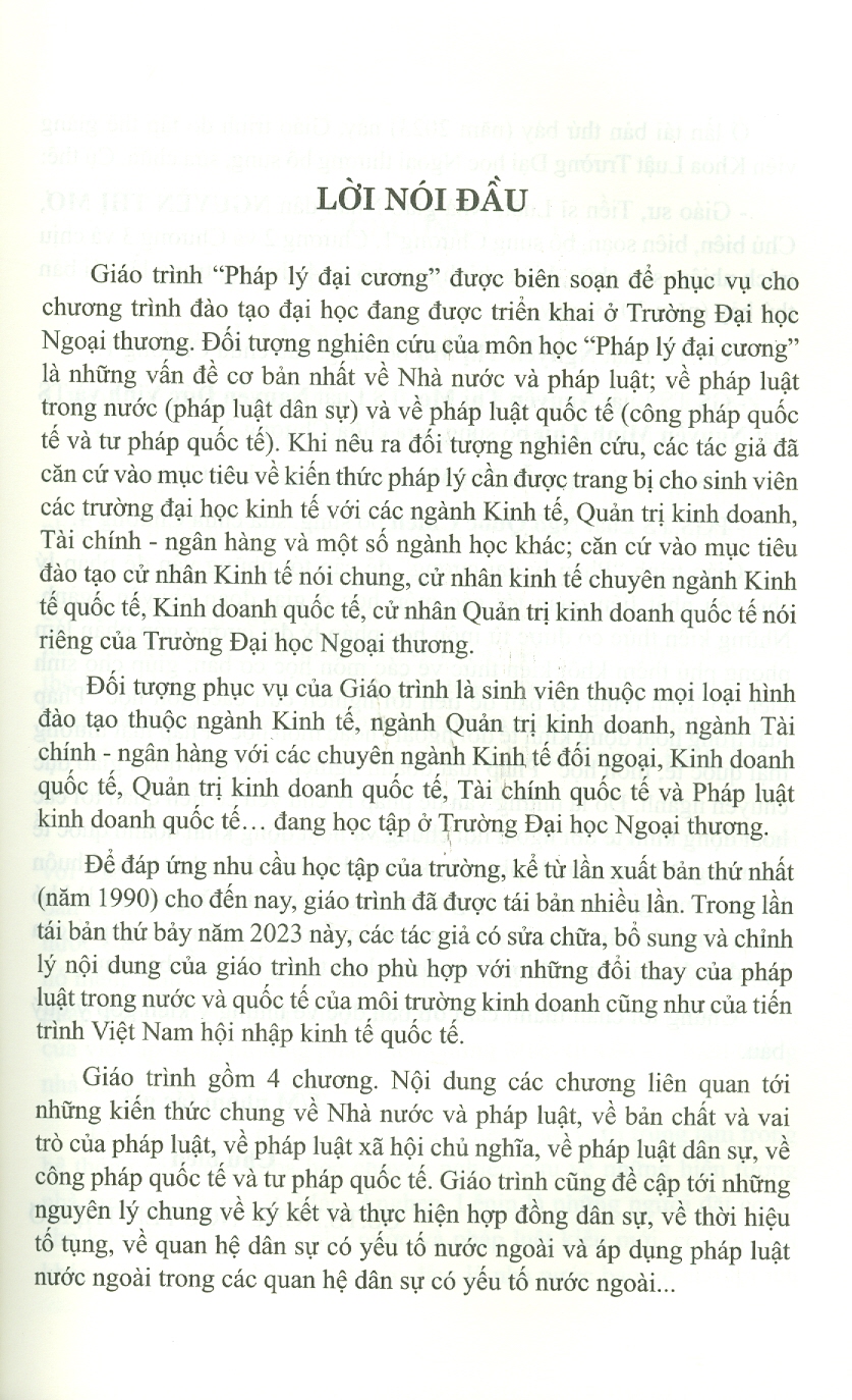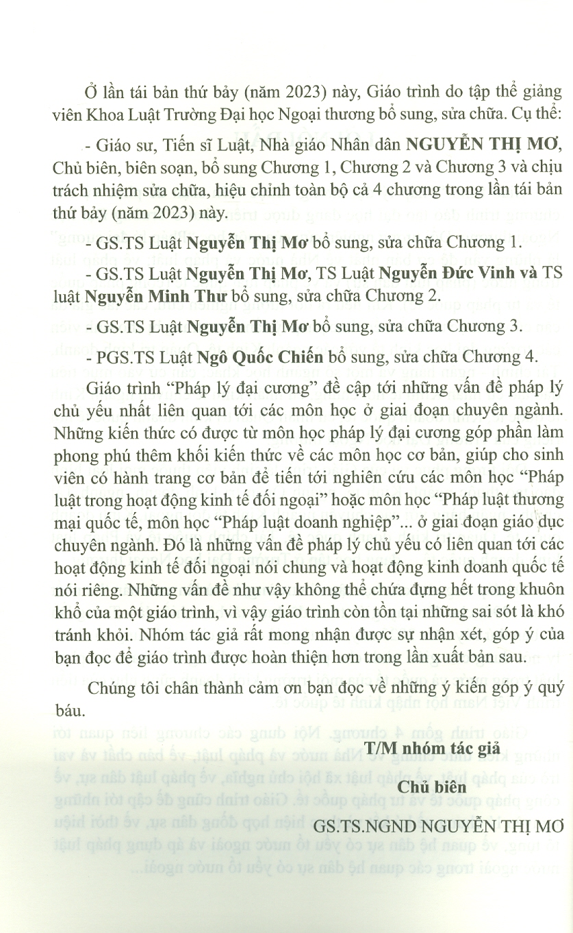 Tên đề tài: Pháp Luật Đại Cương Tác giả: Nguyễn Thị Thanh Thuỷ (Chủ biên), Đào Thu Hà, Trần Văn Nam, Nguyễn Hợp Toàn, Trần Thị Hồng Nhung, Mai Thị Chúc Hạnh Năm tái bản: 2022 Khổ