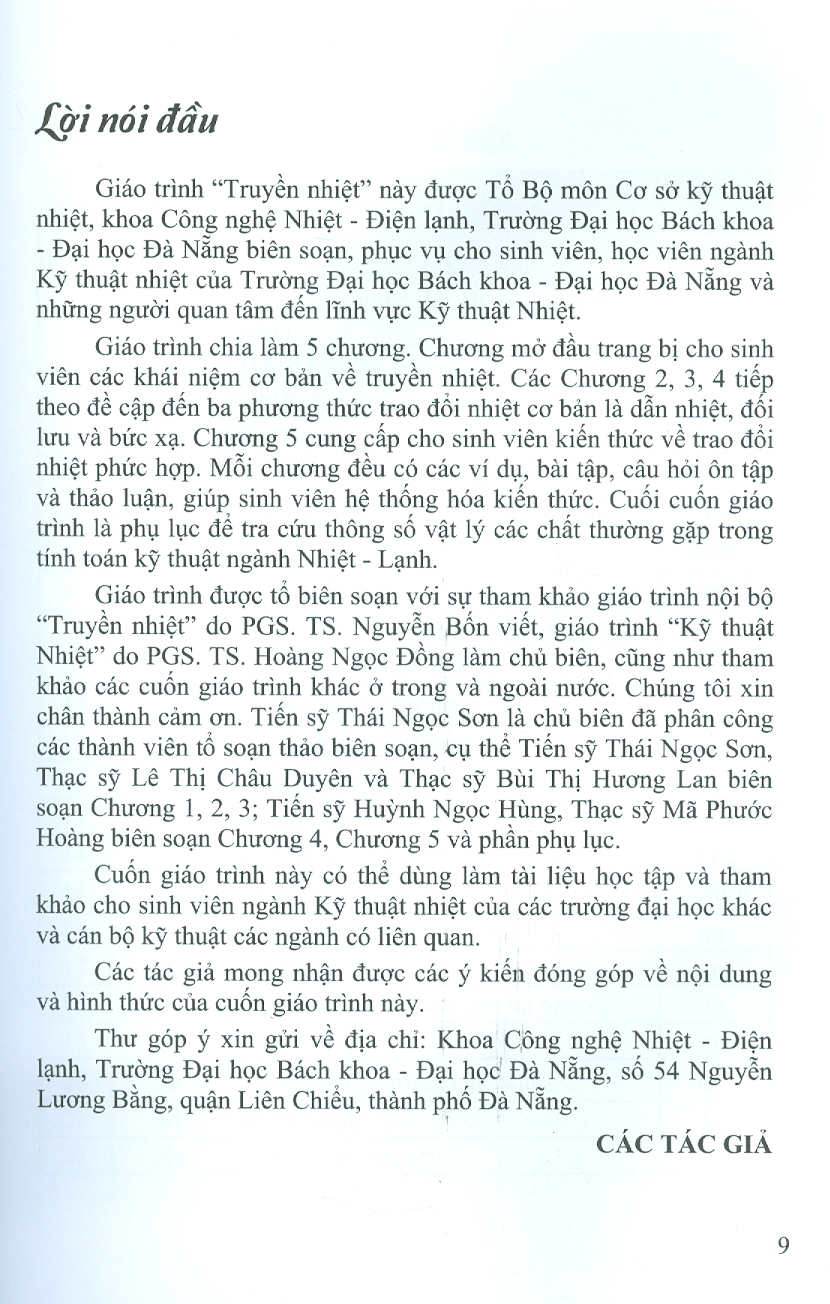 Giáo trình truyền nhiệt này được tổ bộ môn Cơ sở kỹ thuật nhiệt, khoa Công nghệ nhiệt - điện lạnh trường Đại học Bách khoa - Đại học Đà Nẵng biên soạn, phục vụ cho sinh viên, học viên ngành Kỹ thuật nhiệt của trường Đại học Bách Khoa - Đại học Đà Nẵng và những người quan tâm đến lĩnh vực kỹ thuật nhiệt.