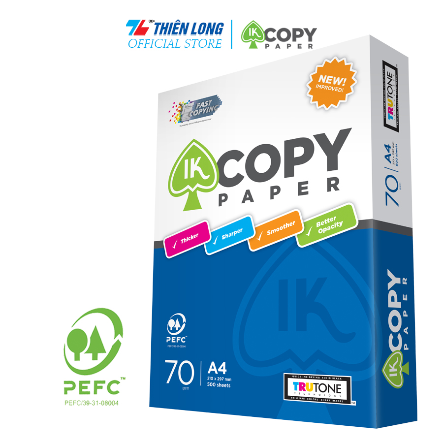IK Copy là sự lựa chọn thích hợp cho mọi nhu cầu sử dụng. Thiết kế vượt trội chạy trên máy photocopy tốc độ cao, số lượng nhiều. Công nghệ Fast Copying ứng dụng trong IK Copy đã được kiểm chứng và tin dùng bởi chất lượng vận hành đồng bộ, không kẹt giấy.