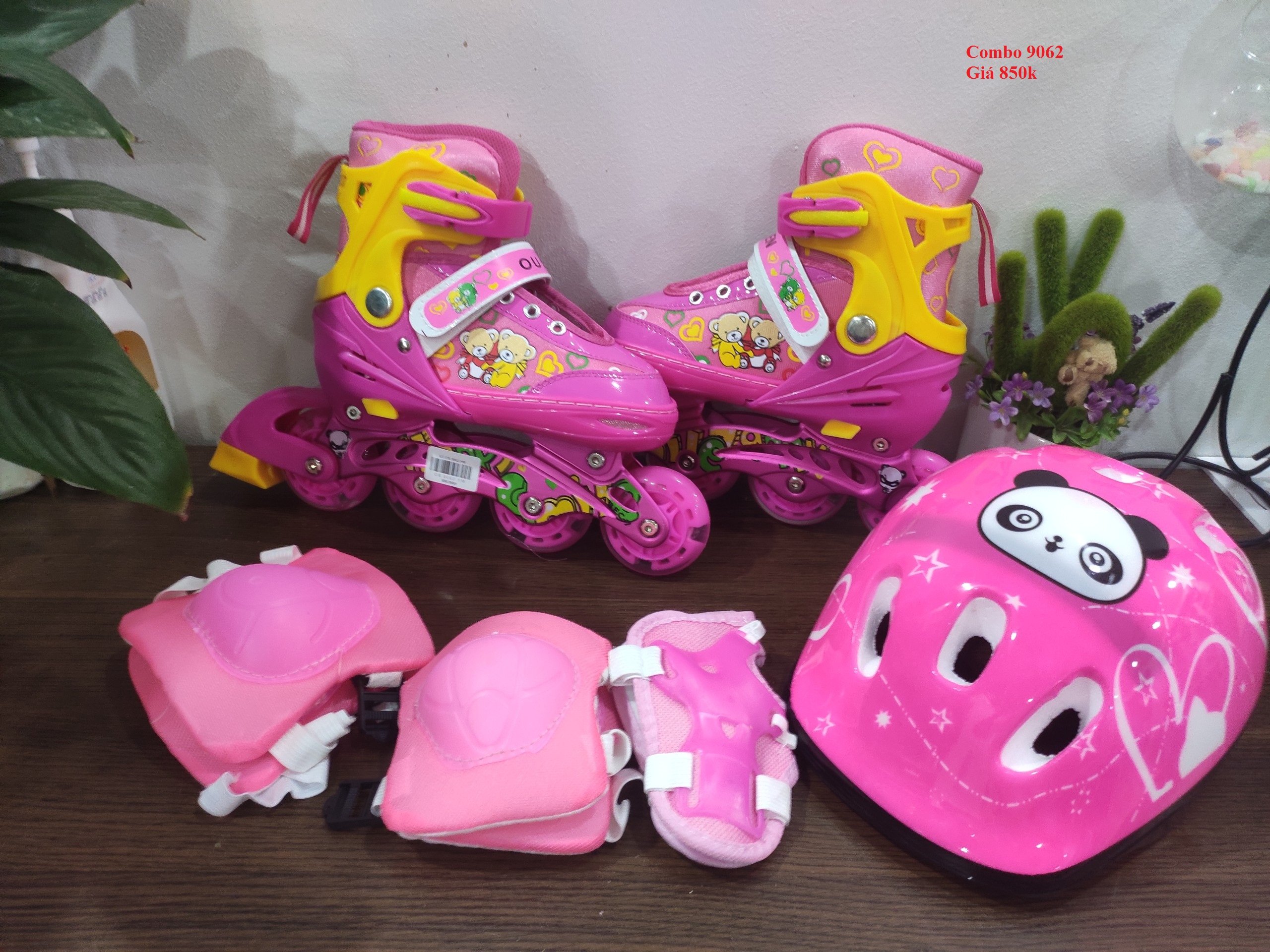 - THÔNG SỐ KỸ THUẬT – Tên sản phẩm: Combo Giày Patin và Bộ Bảo Hộ Trẻ Em 9062 – Combo bao gồm: 1 đôi giày patin, 1 mũ bảo hộ, 1 bộ bảo hộ chân tay 6 miếng (không kèm túi) – Sản xuất tại: Trung Quốc – Loại giày: Trẻ em – Size: S(31-34), M(35-38), L(39-42) – Màu sắc: Xanh, hồng