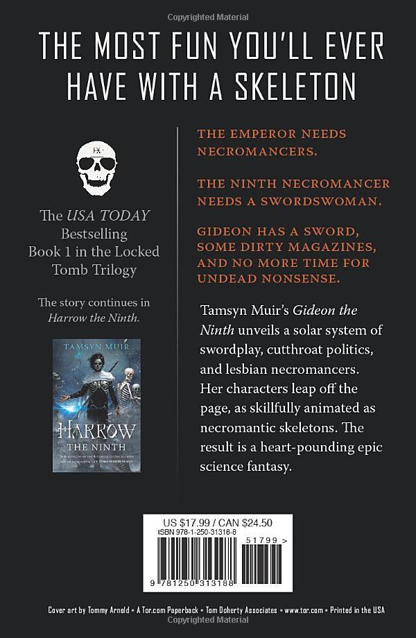 The Emperor needs necromancers. The Ninth Necromancer needs a swordswoman. Gideon has a sword, some dirty magazines, and no more time for undead bull****. Tamsyn Muir s Gideon the Ninth unveils a solar system of swordplay, cut-throat politics, and lesbian necromancers. Her characters leap off the page, as skillfully animated as arcane revenants. The result is a heart-pounding epic science fantasy. Brought up by unfriendly, ossifying nuns, ancient retainers, and countless skeletons, Gideon is ready to abandon a life of servitude and an afterlife as a reanimated corpse. She packs up her sword, her shoes, and her dirty magazines, and prepares to launch her daring escape. But her childhood nemesis won t set her free without a service. The emperor has called his necromancers to action, and Harrowhark is set on Gideon attending her as bodyguard. If Gideon survives, she ll be a hero, and a free woman. If not, she can look forward to eternity as a shambling bone-servant.