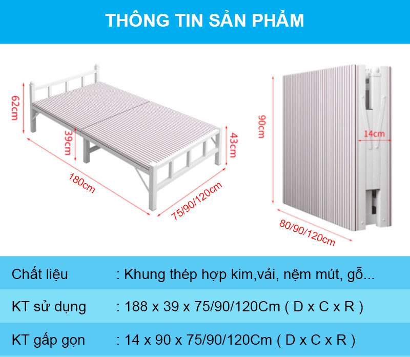 Giường gấp đôi giá rẻ ( KHÔNG ĐỆM ) NIKITA - Khung thép, mặt gỗ, gấp gọn tiện lợi Giường gấp thông minh NIKITA là mẫu giường bán chạy, được nhiều khách hàng tin tưởng và lựa chọn nhất hiện nay. Chúng tôi mang đến cho quý khách hàng nhiều mẫu mã, với nhiều mức giá và kích thước khác nhau để quý khách hàng có thể lựa phù hợp với mục đích sử dụng và không gian của mình. ● Giường gấp hai này là mẫu giường không đệm, thích hợp với người lớn tuổi nằm đệm bị đau lưng, hoặc các bạn sinh viên, công nhân có kinh phí thấp hoặc các công sưởng cần đầu tư số lượng nhiều cho nhân viên. ● Giường có thể gấp gọn tiết kiệm không gian, thích hợp sử dụng trong các không gian nhỏ như phòng trọ, phòng nghỉ giải lao ở công ty, công sưởng. ● Giường có trọng lượng nhẹ dễ di chuyển mang cất vào góc, hoặc trải ra sử dụng khi cần dù phụ nữ hay trẻ em trên 13t đều thao tác dễ dàng.. KÍCH THƯỚC GIƯỜNG: Q115 KÍCH THƯỚC GIƯỜNG: Q135 KÍCH THƯỚC GIƯỜNG: Q137