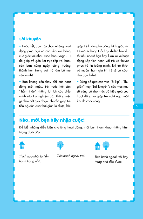 Từ lúc chào đời cho đến khi ba tuổi, đó là khoảng thời gian trẻ tìm cách giao tiếp và, từng bước, thử gắn kết những gì trẻ nhìn thấy với bản thân mình: trẻ như một tờ giấy trắng, trên đó sẽ viết lên những dòng tiểu sử đời mình qua mỗi biến cố. Để giúp trẻ khôn lớn, hiểu rõ các tình huống và tự lập, tập sách này mang đến 35 hoạt động ý nghĩa và rất đơn giản: các trò chơi bằng ngôn ngữ cử chỉ, các bài tập vận động, mát-xa, tập đi, khám phá âm thanh và hình ảnh, yoga,… Mỗi hoạt động đều ghi chú về lứa tuổi cụ thể để cha mẹ có thể lựa chọn phù hợp cho con.