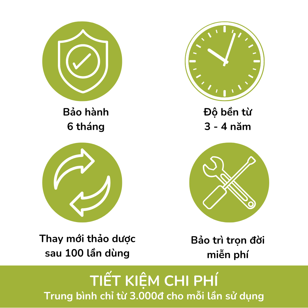 - Độ bền cao (3 - 4 năm). Lõi thảo dược thay thế dễ dàng sau 100 lần dùng