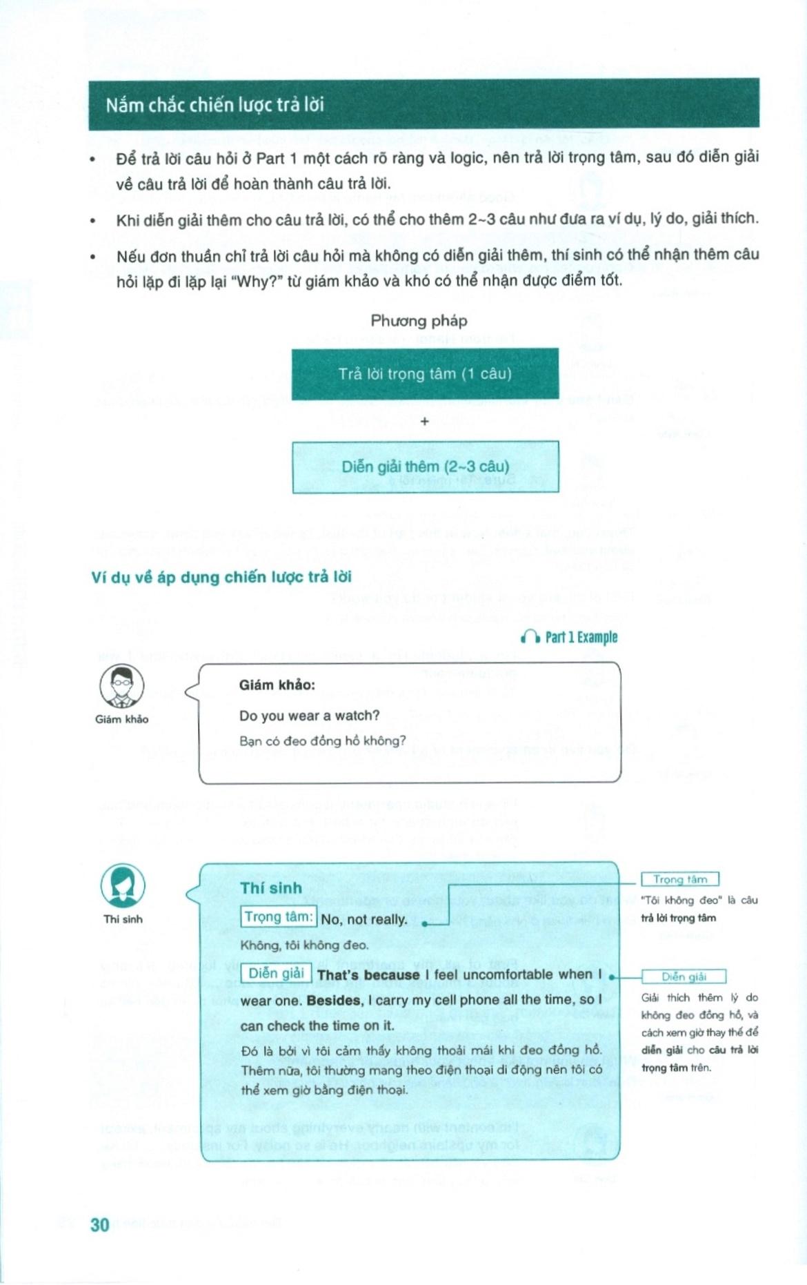Sách sẽ có các dạng bài mẫu không quá khó, cách diễn đạt dễ áp dụng và từ vựng cũng khá là ổn với những bạn đang ở band 5.5 – 6.0 cũng có thể dễ dàng học được. Ở mỗi chủ đề cuốn sách này sẽ chỉ bạn làm bài theo những cái sườn ngắn gọn để trả lời những câu hỏi ở part 1, part 2&3 sau đó sẽ cho bài mẫu để minh hoạ.