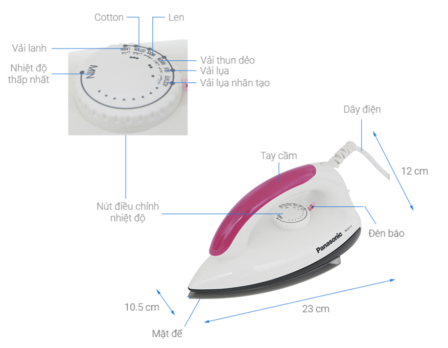- Chất liệu: Đế bằng hợp kim siêu bền tráng men titanium chống dính tốt. Điện trở đúc giúp nóng nhanh mà nguội nhanh. - Mức nhiệt: Chỉnh nhiệt độ theo từng loại vải như:
