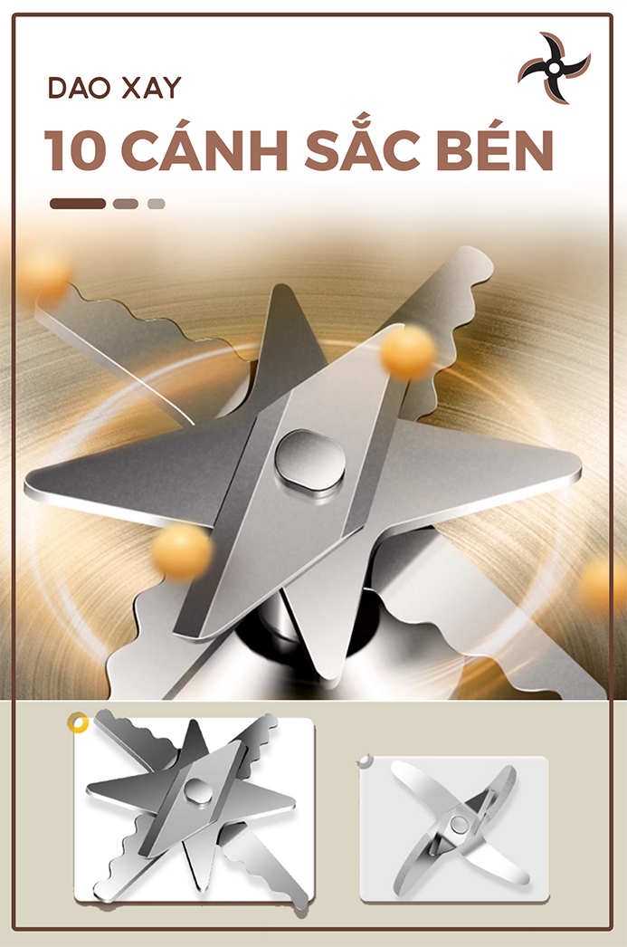1- Dao xay 10 cánh bằng hợp kim không rỉ giúp xay nhuyễn và nghiền mịn nguyên liệu, bạn hoàn toàn không cần phải lọc qua rây để sử dụng.