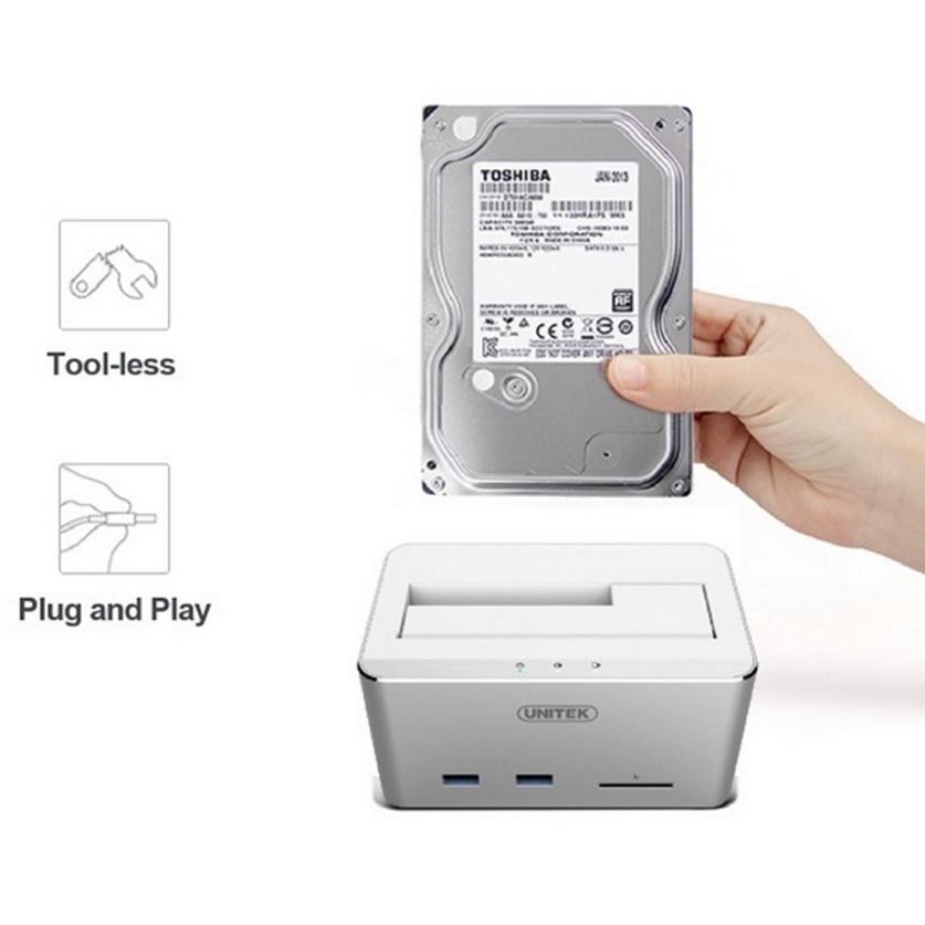 Mua tại TiktokHDD DOCKING STATION USB 3.0 -> SATA III 2.5/3.5 + 2 USB 3.0 + SD UNITEK (Y-1092) MÔ TẢ SẢN PHẨM: HÃNG :tUNITEK TRUYỀN DỮ LIỆUtUSB 3.1 GEN1 SUPERSPEED TỐC ĐỘ TRUYỀNt6Gbps HỖ TRỢ tVỚI UASP(GIAO THỨC SCSI ĐÍNH KÈM USB), TĂNG TỐC ĐỘ TRUYỀN DỮ LIỆU CHO PHÉPtĐỌC VÀ GHI Ổ CỨNG/ SSD , Ổ ĐĨA FLASH , THIẾT BỊ USB VÀ THẺ SD CÙNG LÚC TƯƠNG THÍCH tTẤT CẢ Ổ CỨNG /SSD SATA 2.5GB VÀ 3.5 inch VỚI MỌI DUNG LƯỢNG HỖ TRỢ tSATA III,SATA II VÀ SATA I DOCK CẮM t1 Ổ CỨNG HDD 2.5/3.5 inch +HUB USB 3.0 2 CỔNG +ĐỌC THẺ NHỚ SD
