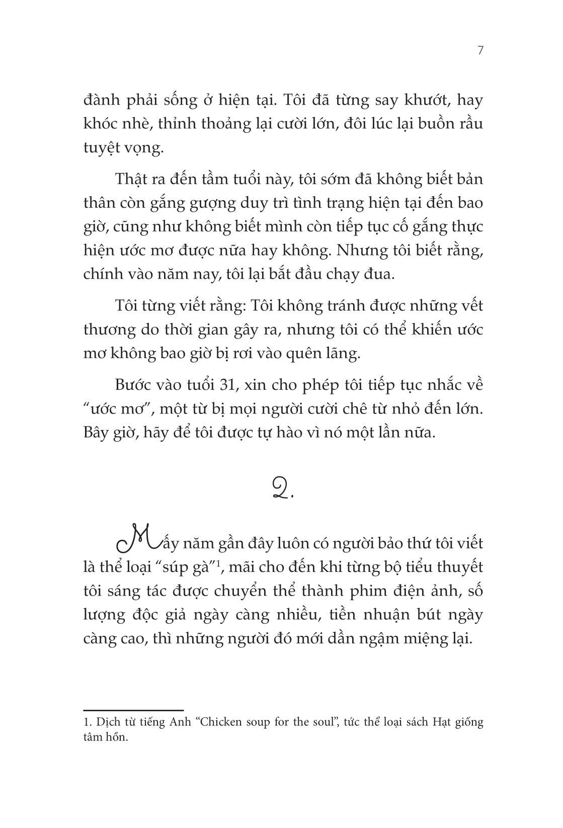 Hẹn Ngày Ta Gặp Nhau Ở Đỉnh Cao “Cái gì không giết được ta sẽ làm ta mạnh mẽ hơn” - một trong những thông điệp được gửi gắm trong cuốn sách Hẹn ngày ta gặp nhau ở đỉnh cao. Thông qua 5 phần của Hẹn ngày ta gặp nhau ở đỉnh cao, người đọc sẽ được lắng nghe những câu chuyện rất đời thường và thấy bản thân m.ình trong mỗi nhân vật. Nội dung cuốn sách Hẹn ngày ta gặp nhau ở đỉnh cao Phần 1: Sự dũng cảm có thể đưa tôi đi xa hơn, khiến tôi kiên cường hơn. Phần 2: Cuộc đời là một bộ thuật toán và một loạt sự lựa chọn. Phần 3: Ngay lúc này đây, mãi mãi là thời khắc bạn trẻ trung nhất. Phần 4: Cảm xúc có thể thấp nhưng lý tưởng phải cao. Phần 5: Món quà thời gian tặng bạn chính là ý nghĩa của sự kiên trì. Ở tuổi thiếu thời, ai trong chúng ta cũng muốn thành người lớn. Nhưng đến khi thực sự đã trưởng thành, nhiều người lại mong mãi mãi được là một đứa trẻ. “Trẻ con nói chuyện yêu ghét, còn người lớn chỉ so sánh giá cả”. Càng lớn, con người càng đặt nặng vấn đề kinh tế. “Tiền” gần như chi phối mọi thứ trong cuộc sống, tiền cũng có thể làm thay đổi ước mơ và mục tiêu sống của cuộc đời. Một bộ máy làm việc cũng chạy theo dòng tiền, để rồi giá cả tăng lên nhưng chất lượng đi xuống, tiếng xấu nhiều hơn, khách hàng cũng đi mất. Tiền có phải là tất cả không? Nhưng tiền không phải tất cả, trên đời còn có nhiều thứ quan trọng hơn tiền. Tình thân, tình yêu, sức khỏe, hạnh phúc… những điều không thể đong đếm được bằng tiền. “Bạn ở đâu thì hãy sống một cuộc sống như thế, nếu khát vọng của bạn đủ lớn, bạn phải làm việc chăm chỉ hơn; nếu khát vọng của bạn không lớn, sống như một con cá muối cũng có làm sao đâu?” Thực vậy, đừng bắt một con cá phải trèo cây, một con chim phải bơi lội. Nếu bạn hát hay, sân khấu với ngàn tiếng vỗ tay mới là điểm đến của bạn. Nếu bạn chỉ muốn một cuộc đời an ổn, không tranh giành, hãy sống như vậy, miễn là vui vẻ. Đừng nhìn vào sự hơn - kém về tiền bạc, sống một cuộc sống không vô nghĩa mới thực sự là cuộc sống có giá trị. Nhưng thế nào mới gọi là cuộc sống ý nghĩa? Ở cuộc sống ấy, chúng ta không nhất định phải thật giàu có, không cần làm ông to bà lớn nhưng phải sống thật hạnh phúc, mỗi ngày thức dậy đều cảm thấy yêu đời, yêu người và tạo nên giá trị. Tiền đề của sự thành công và hạnh phúc là trí tuệ. Có dữ liệu - có thông tin - có kiến thức rồi đến tầng cao nhất là trí tuệ. Có trí tuệ để biết đúng sai, để phân tích logic, để hiểu được thiệt - hơn của sự lựa chọn. Và hơn hết, đừng học cách đổ lỗi, thay vào đó, hãy thích ứng. Thời kỳ đại dịch bùng nổ, kinh tế trì trệ, thế giới “đóng cửa” một thời gian, quả thực ai cũng gặp khó. Nhưng nhiều người đã biết cách vượt lên từ những trở ngại, trong khi số khác chỉ biết thở dài lắc đầu. Những thay đổi sau tuổi 30 - thời gian không chờ đợi một ai Trước 30 tuổi, chúng ta luôn nghĩ m.ình còn trẻ, mọi thứ vẫn có thể từ từ. Nhưng sau 30 tuổi, nhiều người giật m.ình nhận ra “cuộc đời đã bước sang trang mới”, trang của độ tuổi trung niên. Sau 30 tuổi mới thấy nhiều áp lực, áp lực thành công, áp lực trang lứa, áp lực kinh tế… Liệu những người thất bại có thể bắt đầu lại ở độ tuổi 30? Không bao giờ là muộn để bắt đầu. Ở năm 30 tuổi, bạn không còn sung sức như hồi trẻ nhưng khi nhiệt huyết vẫn còn, niềm đam mê vẫn có, bạn hoàn toàn có thể bắt đầu. Làm những điều m.ình thích, yêu những điều m.ình làm, miễn là điều đó tích cực và có ý nghĩa. Để nếu sau này vô tình gặp lại bạn cũ, chúng ta đều vui vẻ, tự tin, mỉm cười chào nhau và gật đầu cho biết chúng ta rất hạnh phúc. Không ai có thể đánh bại thời gian, càng không thể quay ngược thời gian. Nhưng điều chúng ta có thể làm là khiến bản thân trở nên tốt hơn và xứng đáng với thời gian. Chúng ta đi từng bước, dù chậm nhưng chắc chắn, mỗi ngày leo một bậc thang, đến một ngày sẽ leo lên tới đỉnh. Ở đỉnh cao đó, chúng ta đều có thể gặp được những người ưu tú và đặc biệt là gặp được một phiên bản tốt hơn của chính bản thân. Vì vậy, qua cuốn sách Hẹn ngày ta gặp nhau ở đỉnh cao tác giả Lý Thượng Long muốn nhắn nhủ đến tất cả độc giả một lời khuyên chân thành: “Nếu cuối cùng đều phải nói lời tạm biệt, hãy nói lời tạm biệt với bản thân tồi tệ trong quá khứ của bạn đi!” Vài nét về tác giả: Lý Thượng Long là nhà văn, đạo diễn và biên kịch trẻ của Trung Quốc. Anh đã sáng lập Học viện Feichi và đồng sáng lập Khảo Trùng (công ty chuyên dạy học trực tuyến cho học sinh). Năm 2010, anh giành giải quán quân Bắc Kinh và giải ba toàn quốc trong cuộc thi tài năng Tiếng Anh "Star of Hope" của CCTV. Anh cũng là tác giả có