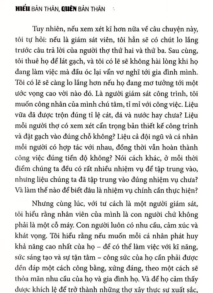 “Hiểu bản thân, quên bản thân” mang đến những hướng dẫn rõ ràng, những bài thực hành đơn giản để ta có thể đón nhận những nghịch lí trọng tâm của cuộc đời, tận dụng chúng để tăng cường mức độ hiệu quả và hạnh phúc của chính mình.