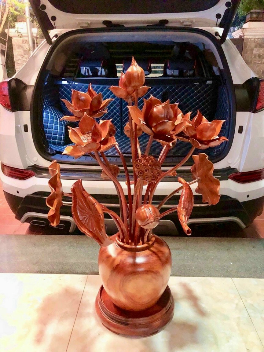 _ Bình hoa sen được làm bằng chất liệu gỗ hương đỏ tự nhiên 100% _ Kích thước cao tổng thể 85cm ,kt xòe 56cm ,tổng 17bông tính cả gương sen _ Kích thước bình
