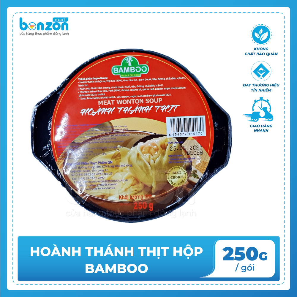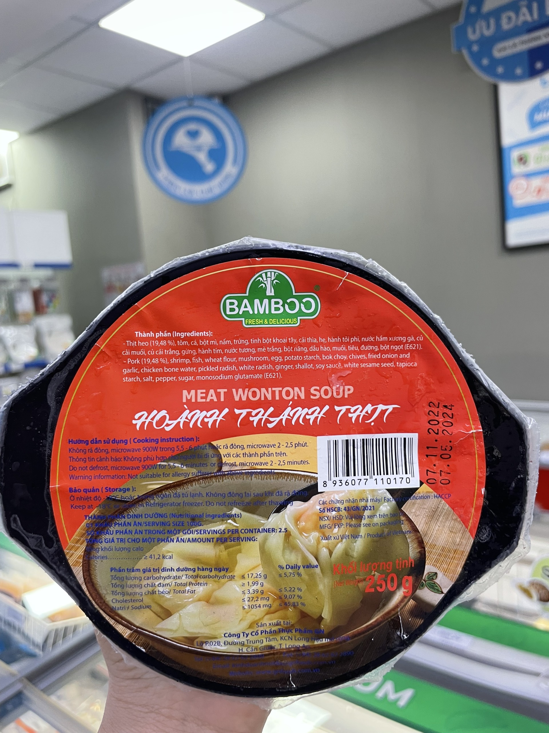 Mua tại TiktokVới sản phẩm tươi sống, trọng lượng thực tế có thể chênh lệch khoảng 10%. ĐỊNH LƯỢNG: (15g/cái x 6 cái/gói) + (110g soup + 50g rau) THÀNH PHẦN: Thịt heo, tôm, nấm đông cô, bột hoành thánh MÔ TẢ SẢN PHẨM: Vỏ màu vàng, mỏng, mềm với phần nhân từ thịt và nấm bên trong CÁCH CHẾ BIẾN: - Không rã đông, microwave 900W trong 5.5-6 phút - Hoặc rã đông, microwave 2-2,5 phút BẢO QUẢN: - Giữ đông từ -15 đến -18°C. Không đông lại sau khi rả đông - Bảo quản mát từ 0°C đến 5°C trong 3 ngày HSD: 12 Tháng