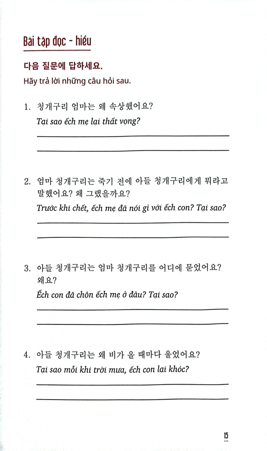 Mua tại TiktokHọc Tiếng Hàn Qua Truyện Cổ Tích GIỚI THIỆU SÁCH: Học Tiếng Hàn Qua Truyện Cổ Tích được thiết kế dành cho những người học tiếng Hàn đang muốn cải thiện trình độ của mình, đồng thời tìm hiểu về văn hóa Hàn Quốc thông qua việc đọc các câu chuyện cổ tích.