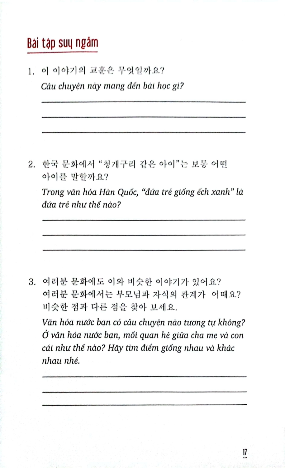 Những câu chuyện này đã được truyền lại qua nhiều thế hệ và mang đến cái nhìn độc đáo về tín ngưỡng và truyền thống đã in sâu vào gốc rễ của xã hội Hàn Quốc, thể hiện các giá trị truyền thống của Hàn Quốc, nhất là chứa đựng nhiều từ vựng thông thường trong tiếng Hàn. Thông qua việc đọc sách, người học tiếng Hàn sẽ hiểu sâu hơn về văn hóa Hàn Quốc, và cũng có thể nâng cao kỹ năng giao tiếp bằng ngôn ngữ này.