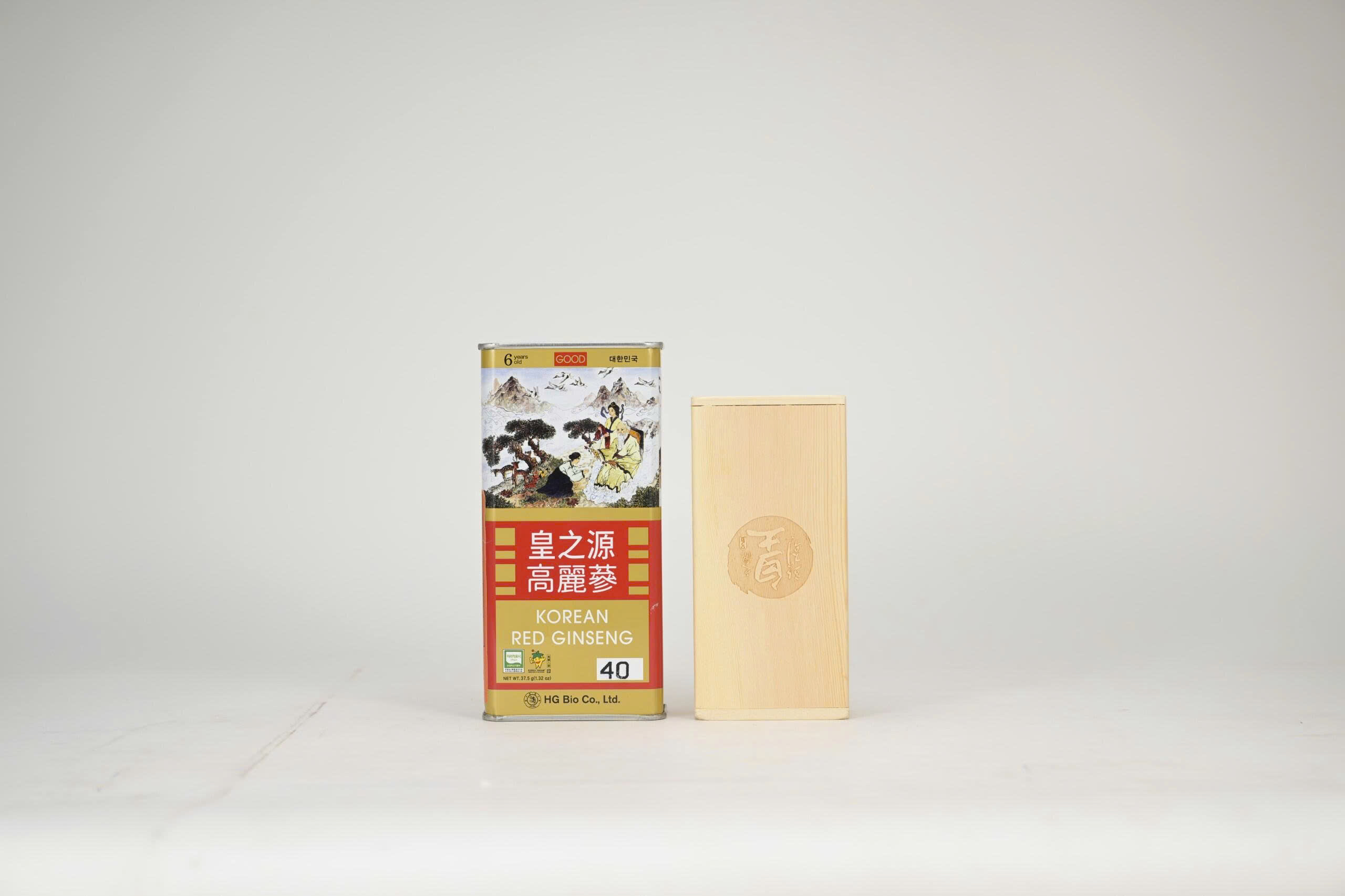Hồng sâm củ khô hộp thiếc 37.5g Thành phần: - 100% nhân sâm Hàn Quốc qua quá trình hấp sấy thành hồng sâm củ khô nguyên chất, được sấy khô và đóng hộp gỗ bên