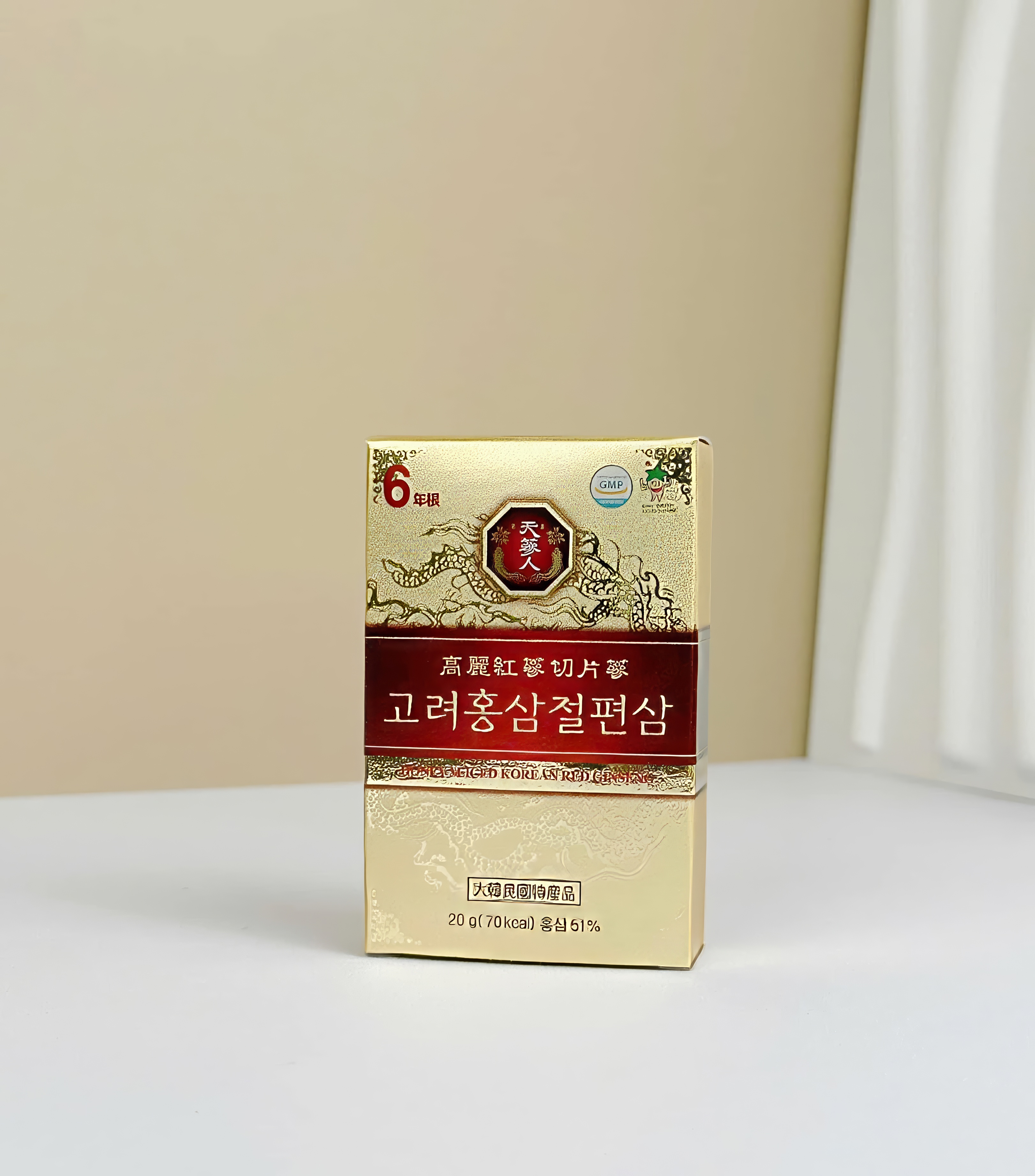 Hồng sâm củ khô hộp thiếc 37.5g Thành phần: - 100% nhân sâm Hàn Quốc qua quá trình hấp sấy thành hồng sâm củ khô nguyên chất, được sấy khô và đóng hộp gỗ bên