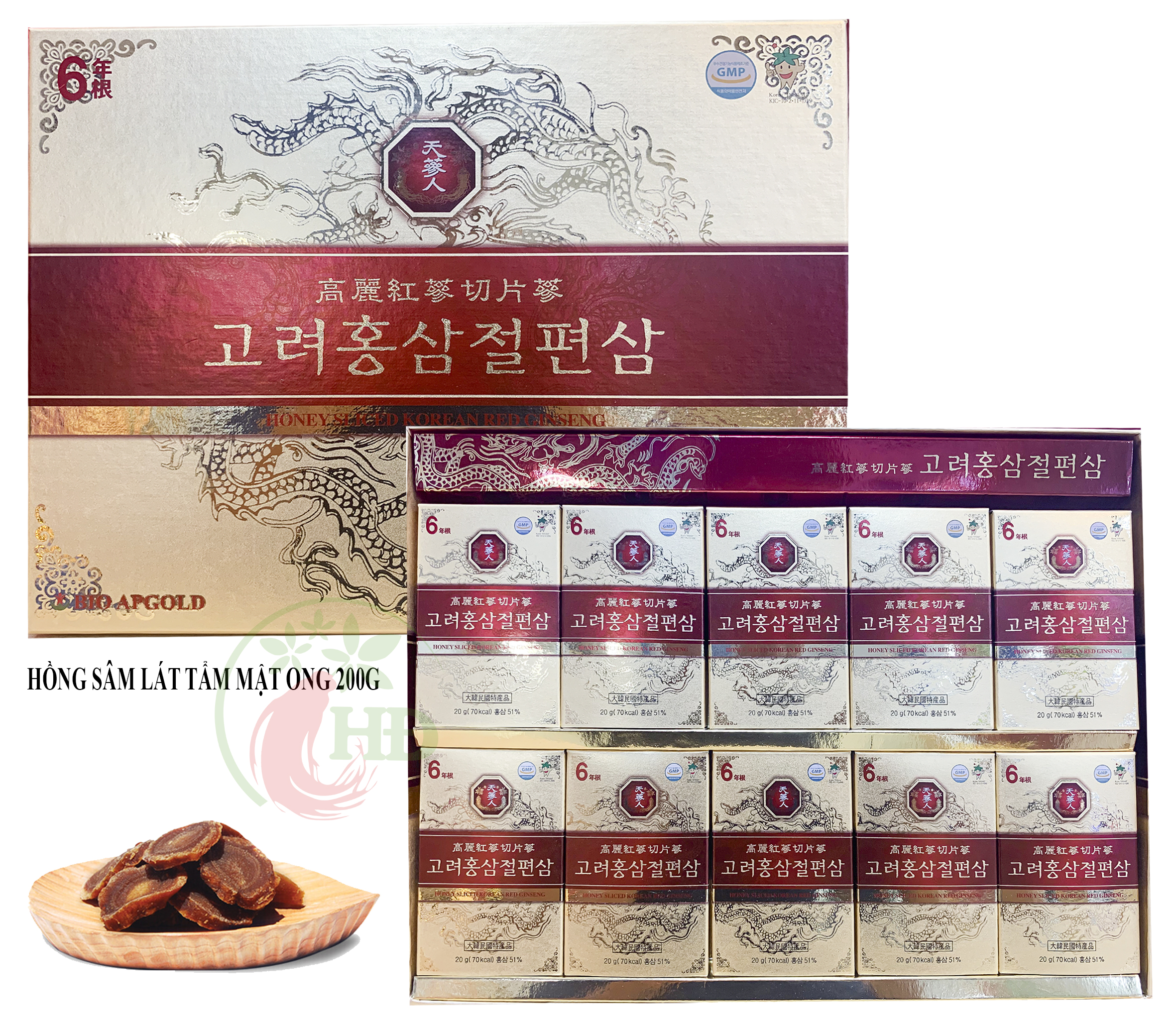 Hồng sâm Hàn Quốc lát tẩm mật ong Pocheon 200g được làm từ hồng sâm củ nguyên chất xắt lát, sản phẩm được đóng gói 20g/gói và được đóng trong hộp nhỏ, rất dễ mang theo