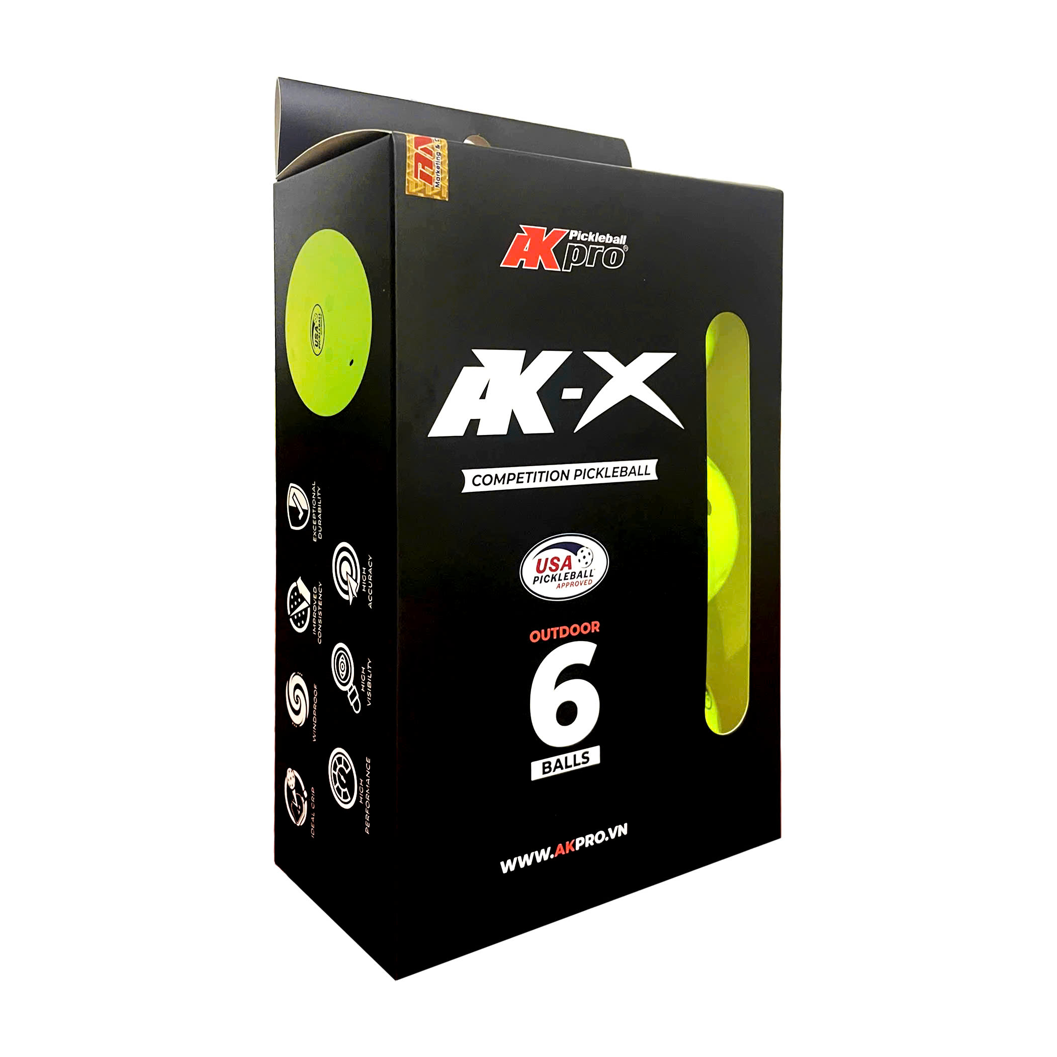 Bóng Pickleball AK-X có bề mặt nhám để tăng độ bám. Bóng phù hợp với mọi giải đấu ngoài trời. Bóng đóng hộp 6 quả.