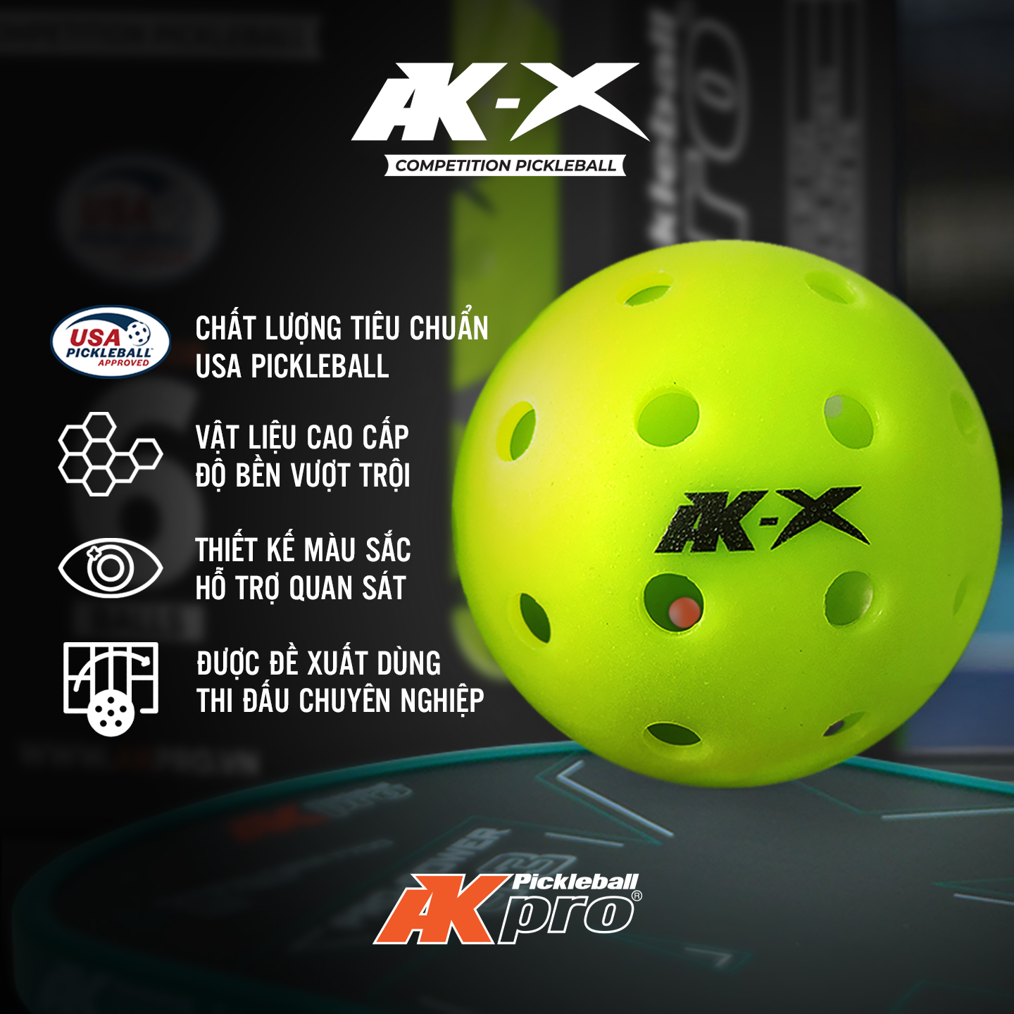 Bóng Pickleball AK-X đạt chứng nhận USA Pickleball Approved sử dụng vật liệu PE cao cấp được đúc nguyên khối, 40 lỗ. Trọng lượng, kích thước và độ nảy tiêu chuẩn ngoài trời. Bóng có đường bay ổn định, bám mặt vợt và rất bền.