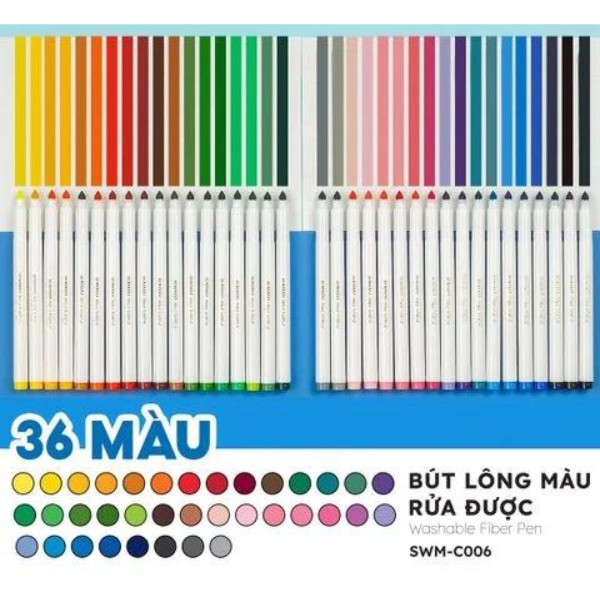 Bộ bút lông 36 màu Fiber Pen Washable Colokit SWM-C006 chất liệu mực an toàn có thể rửa được, không độc hại, không tạo mùi khó chịu khi sử dụng. An toàn với sức khỏe của bé. Sản phẩm đạt chứng nhận không độc hại, bảo vệ môi trường từ EU và US.