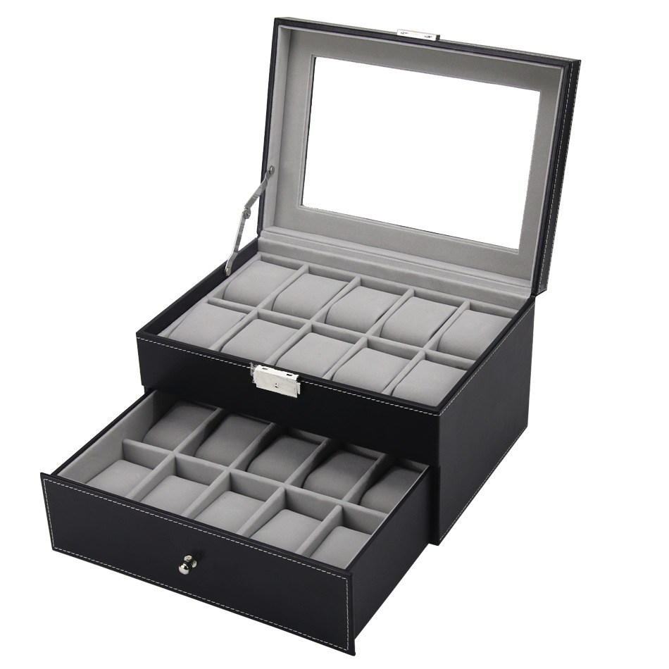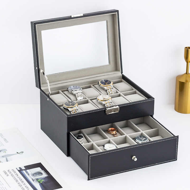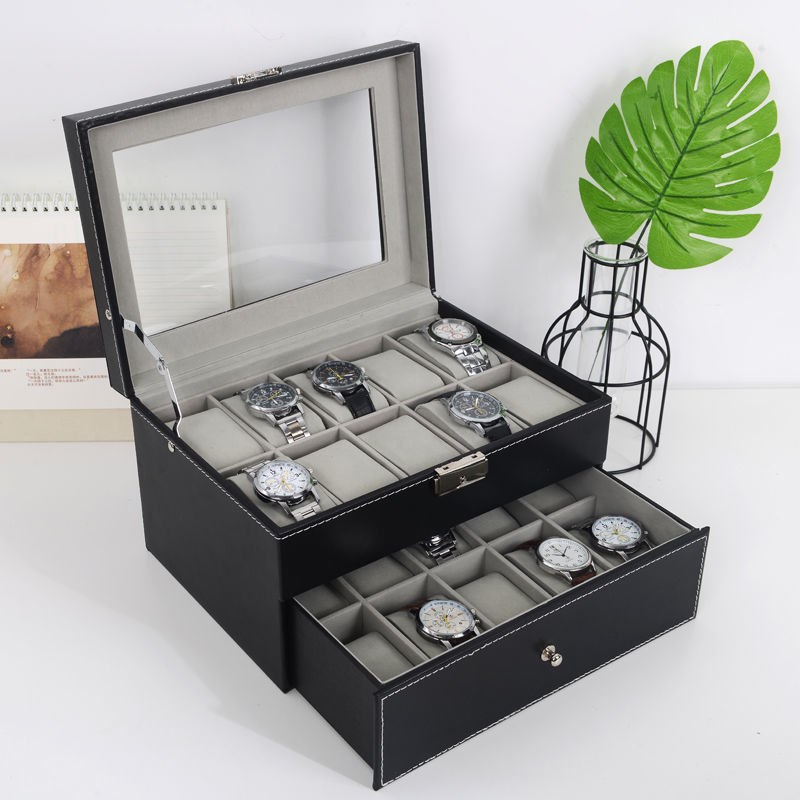 - Hộp thiết kế 2 tầng mỗi tầng đựng 10 cái đồng hồ, tầng trên có khóa, tầng dưới kiểu ngăn kéo