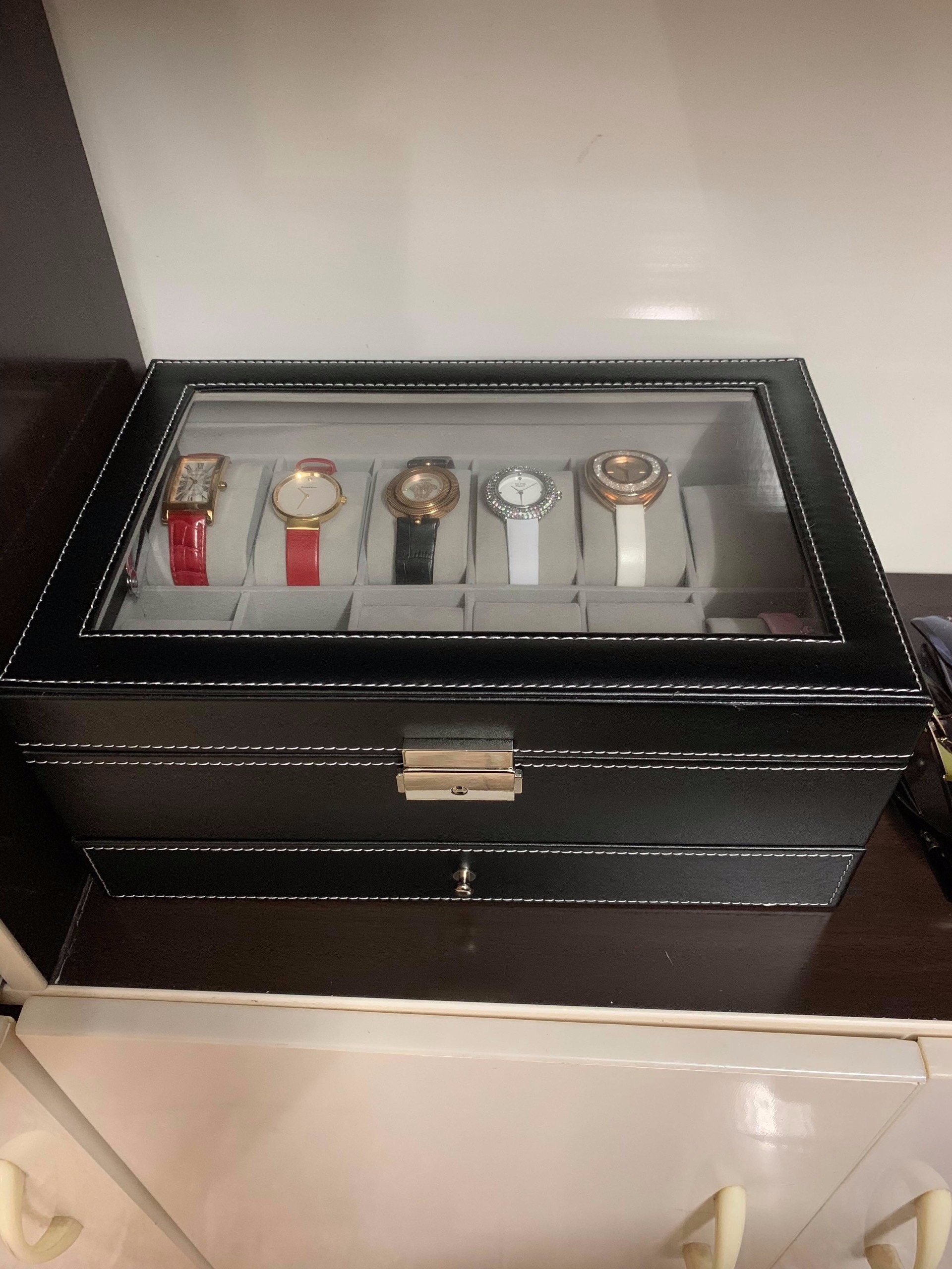 Bạn có khoảng 6-8 chiếc đồng hồ và phụ kiện trang sức như nhẫn, vòng ùng với đó bạn thích hộp có mặt kính để nhìn thấy phụ kiện bên trong hộp và hộp có