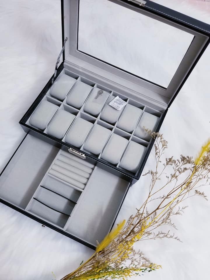 - Hộp có nắp kính, tầng trên có khóa, có sẵn cục mút để đồng hồ, tầng dưới kiểu ngăn kéo đựng trang sức, mắt kính..