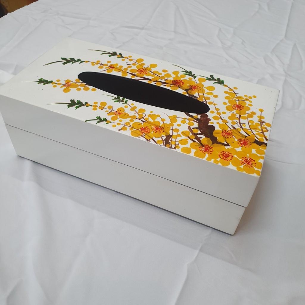 Công dụng: Hộp đựng khăn giấy được thiết kế tinh sảo, nhỏ gọn từ ngoài vào trong, bên ngoài được vẽ hoa mai vàng, bên trong dùng để đựng khăn giấy, tạo sự sang trọng cuốn hút, mới lạ đối với người nhìn