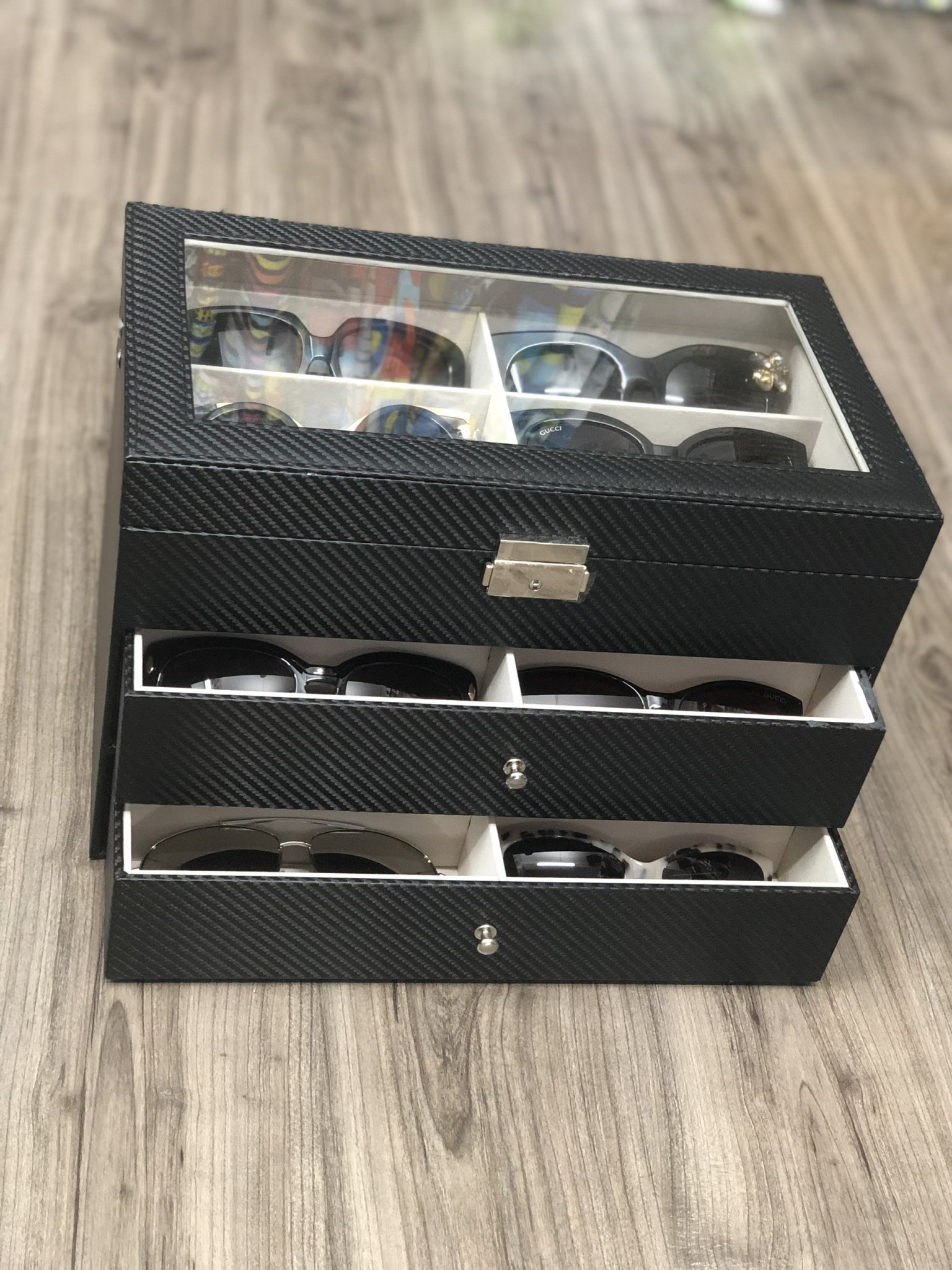Hộp Tủ Đựng 18 Mắt Kính 6 Đồng Hồ & Trang Sức - 4 Tầng Vỏ Da Carbon - DHK4T
