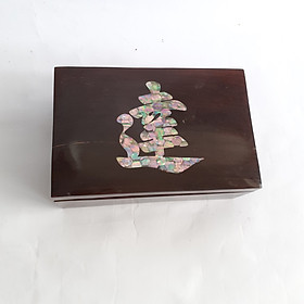 Hộp đựng trang sức- Hộp khảm trai Giao mẫu ngẫu nhiên Nguyên liệu: gõ hương, gỗ trắc tự nhiên Kích thước :Dài 26cm x Rộng 13cm x cao 10cm Hộp khảm trai, khảm chữ trên